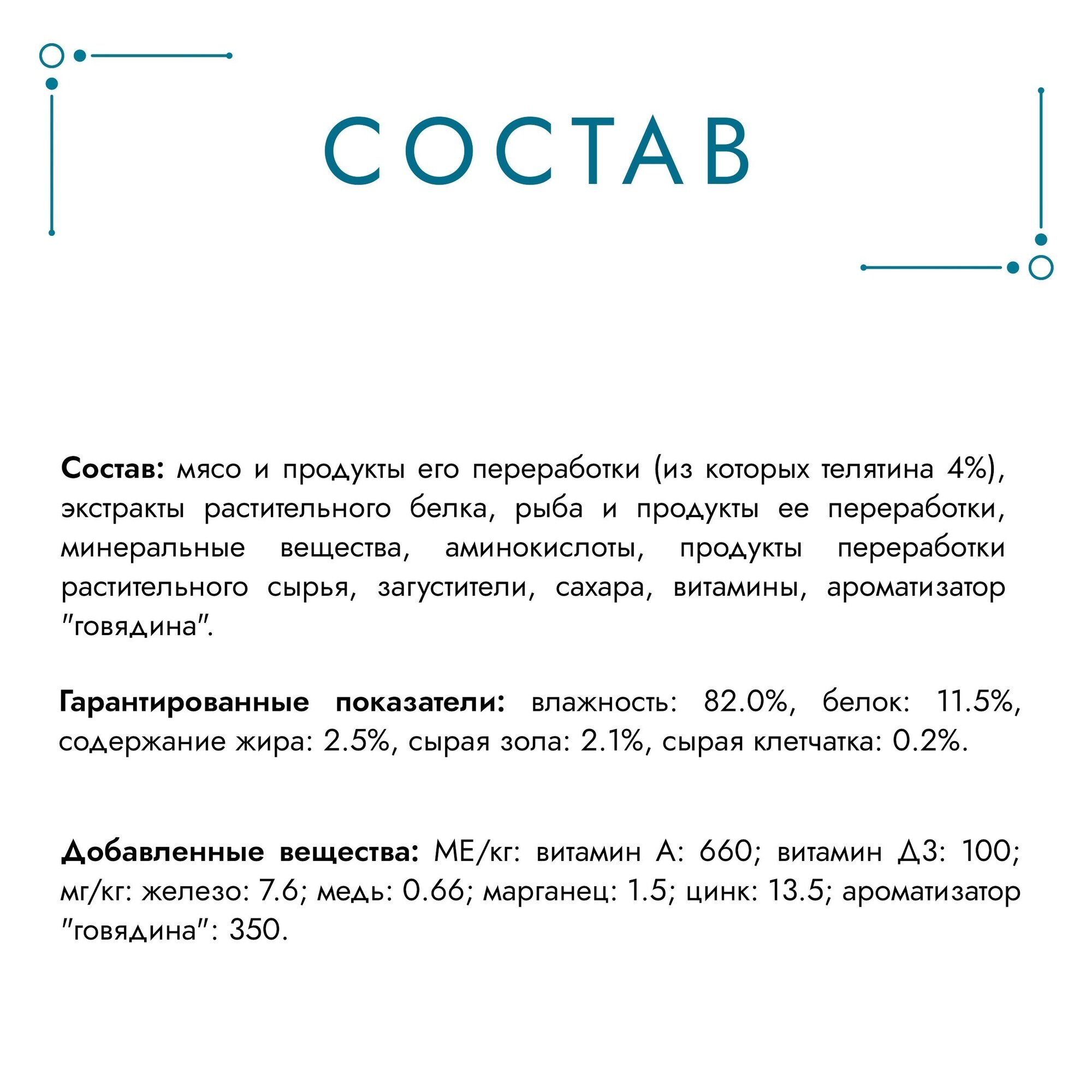 | Состав | Состав Мясо и продукты его переработки (из которых телятина 4%), экстракты растительного белка, рыба и продукты ее переработки, минеральные вещества, аминокислоты, продукты переработки растительного сырья, загустители, сахара, витамины, ароматизатор "говядина". |