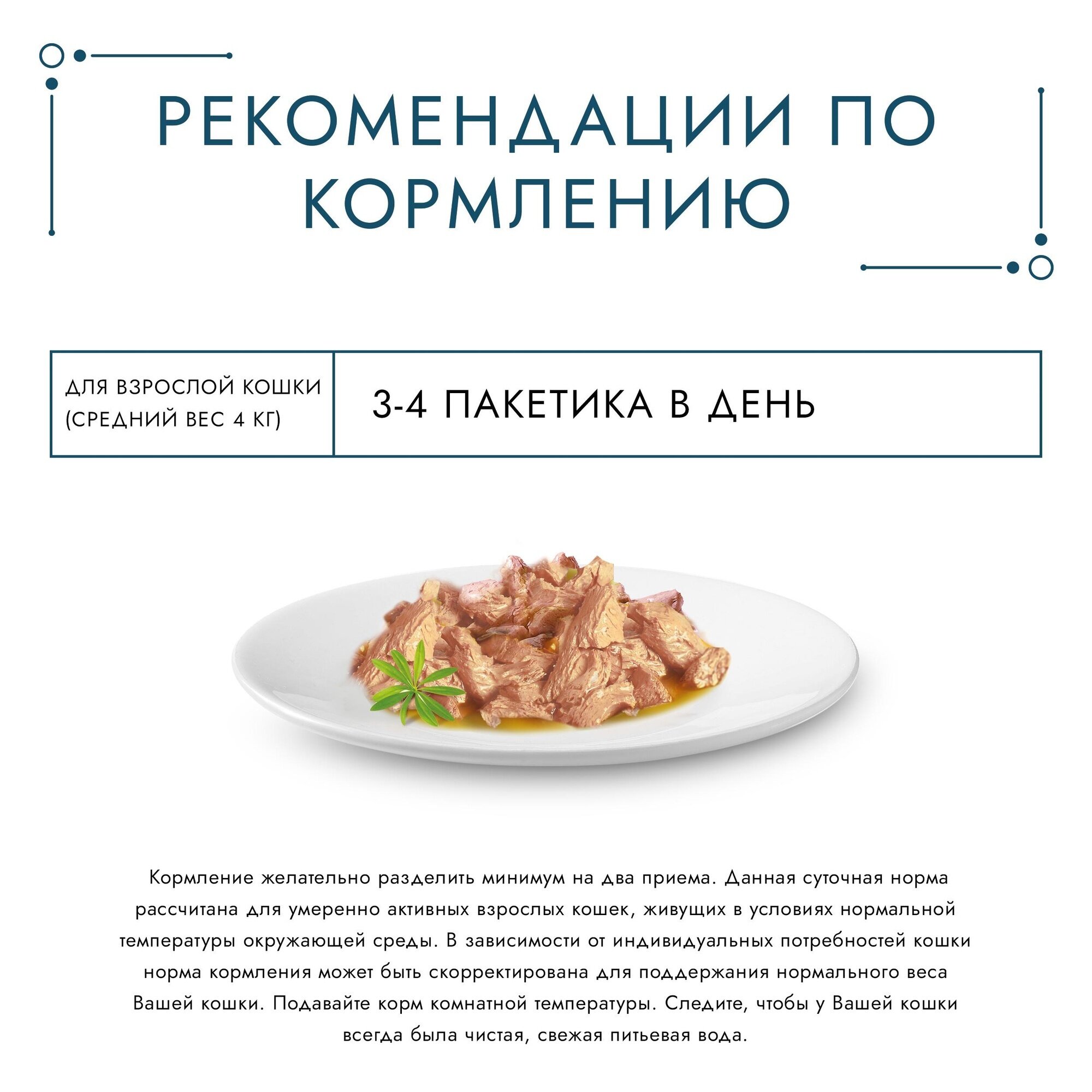 | Рекомендации | Рекомендации по кормлению: для взрослой кошки среднего веса (4 кг) требуется 3-4 пакетика в день. Кормление желательно разделить минимум на два приема. Данная суточная норма рассчитана для умеренно активных взрослых кошек, живущих в условиях нормальной температуры окружающей среды. В зависимости от индивидуальных потребностей кошки норма кормления может быть скорректирована для поддержания нормального веса Вашей кошки. Подавайте корм комнатной температуры. Следите, чтобы у Вашей кошки всегда была чистая, свежая питьевая вода. |