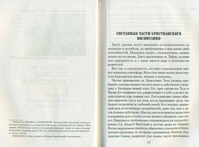 В сборник вошли труды святых отцов и известных духовных писателей - свт. Феофана Затворника, прп. Паисия Святогорца, архиеп. Варлаама (Ряшенцева), Пестова Н.Е., прот. Валериана Кречетова, прот. Димитрия Смирнова - на тему христианского воспитания детей: о воспитании в младенчестве и в школьный период, о проблемах "переходного возраста", как приучать детей к молитве, хождению в храм, посту, когда ругать и когда хвалить ребенка, как оградить детей от соблазнов мира и как не разрушить с ними сердечных отношений. На обложке - фрагмент картины "Святитель Леонтий, епископ Ростовский" (1987 г.) игумена Рафаила (Симакова).