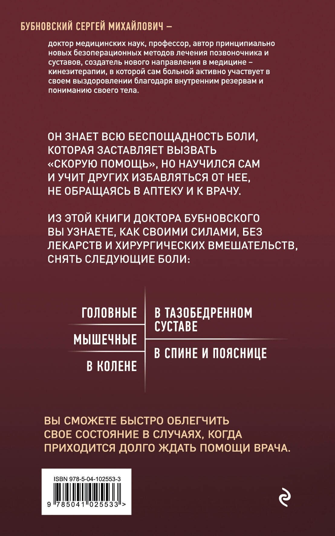 Новая книга доктора Сергея Бубновского, профессора, доктора медицинских наук, посвящена неотложной помощи при острых болях без лекарств и оперативного вмешательства. Привычка при каждом случае вызывать «Скорую помощь» или принимать лекарственные препараты, часто наобум, в будущем может стоить человеку активности, здоровья и даже жизни, считает доктор Бубновский. Люди не понимают принципов работы организма, полагаясь на врачей «Скорой», которые могут в нужный момент не оказаться рядом.