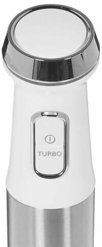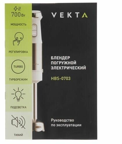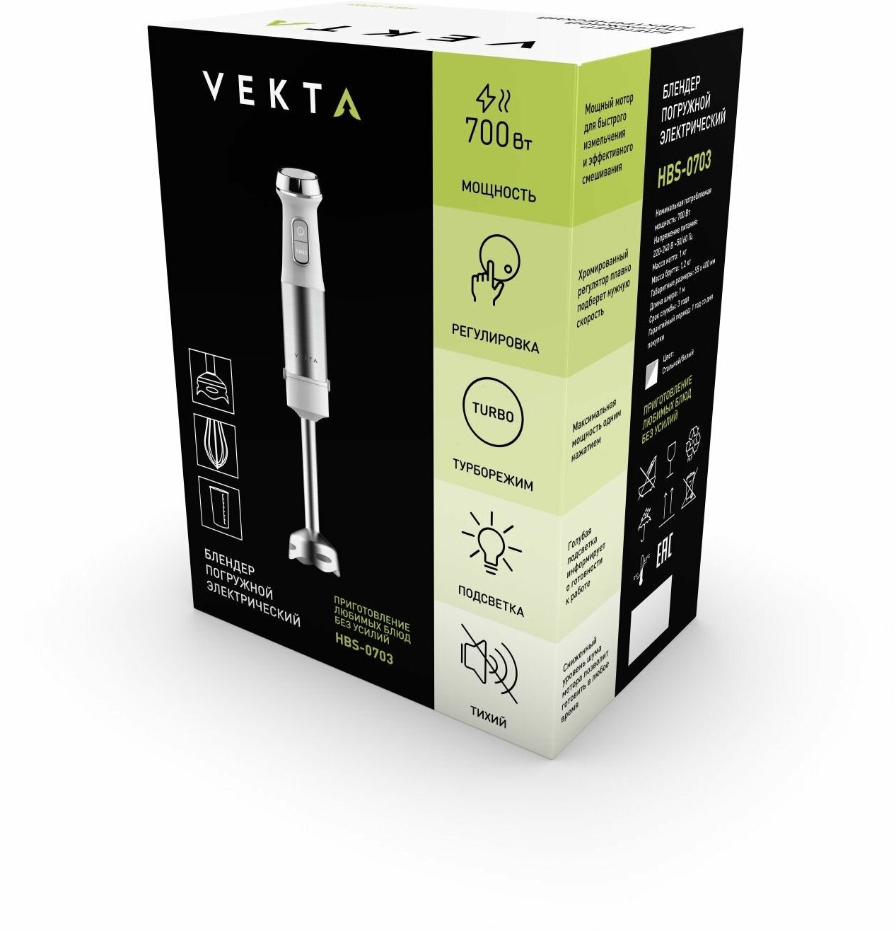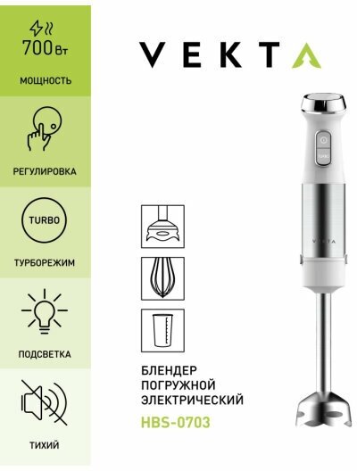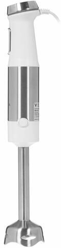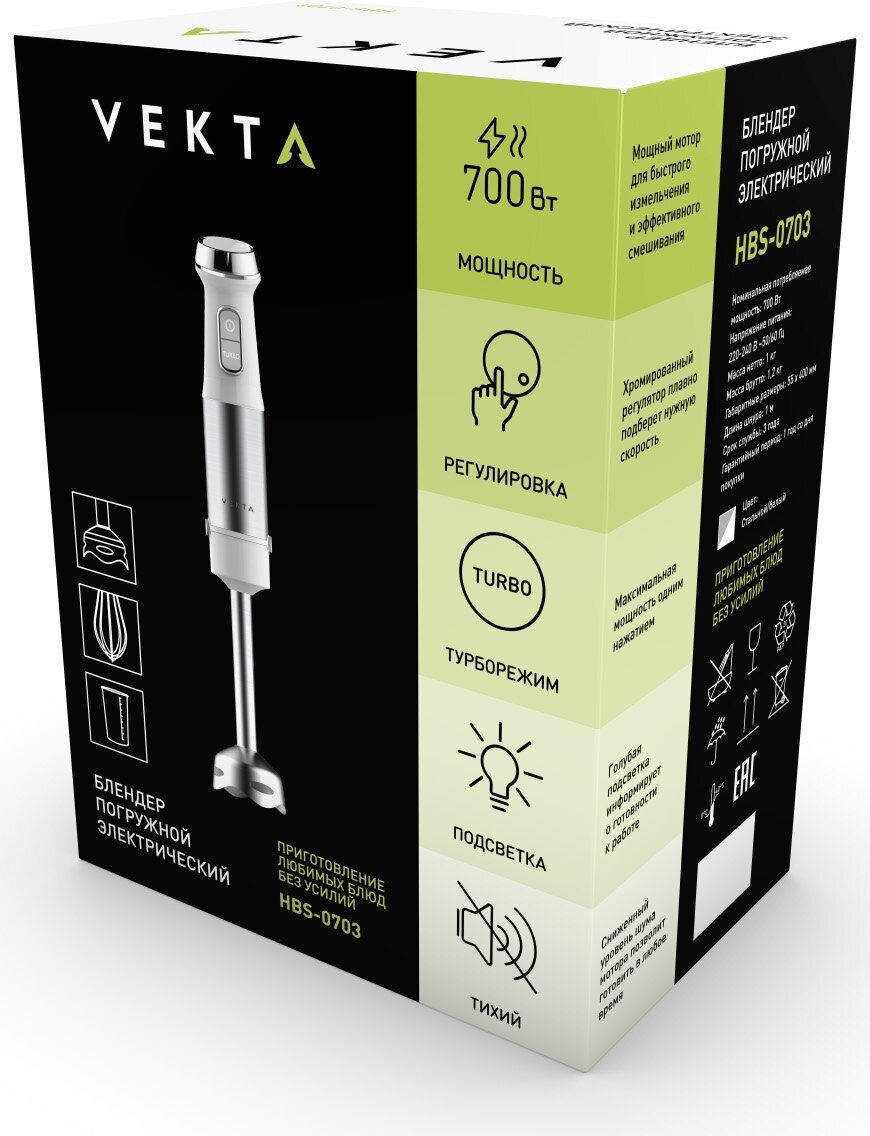 Погружной блендер VEKTA HBS-0703 оснащен мощным мотором для быстрой и эффективной обработки продуктов. Необходимый режим работы подбирается легким движением одного пальца, с помощью плавного переключателя скорости, декорированного хромом, а кнопка ТУРБО моментально переключит скорость на максимальную. Основная часть корпуса выполнена из металла и матового пластика, что делает его прочным и надежным в использовании. При включении в сеть, регулятор скорости и основные кнопки подсвечиваются красным светом. Модель укомплектована венчиком для взбивания и объемным мерным стаканом. Погружная часть блендера с ножами изготовлены из высококачественной нержавеющей стали.