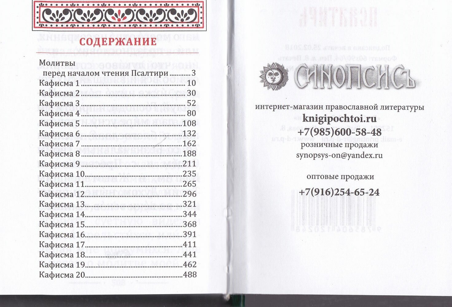 Псалтирь содержит молитвы перед началом чтения Псалтири, кафисмы, молитвы по прочтению нескольких кафисм или всей Псалтири, а также указатель псалмов, читаемых в различных нуждах.