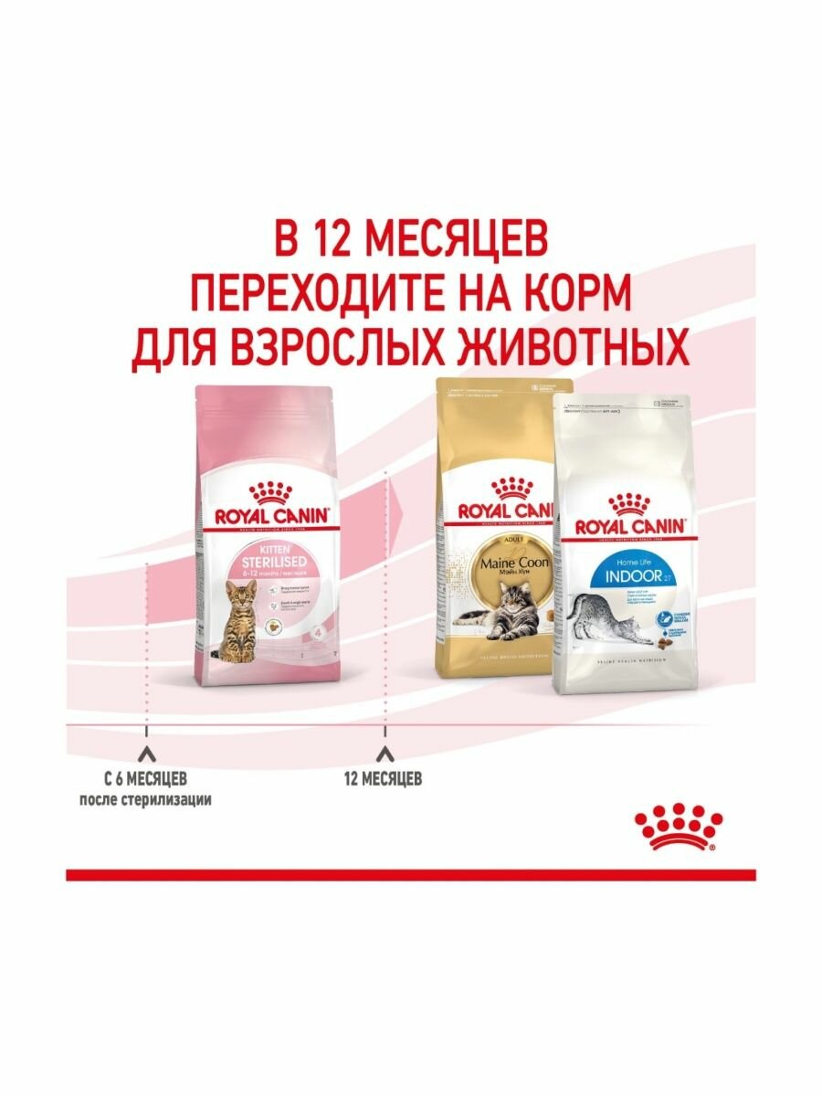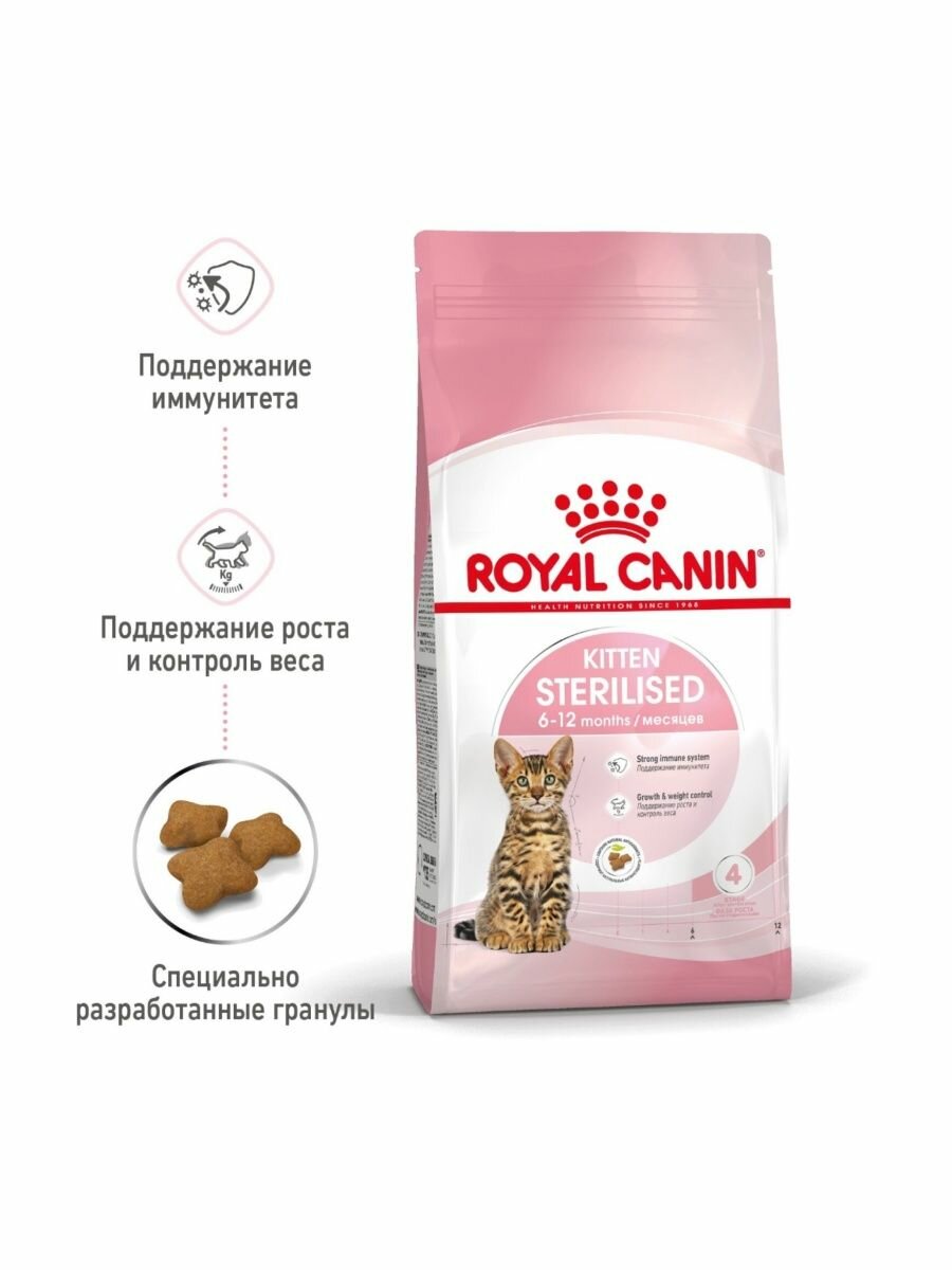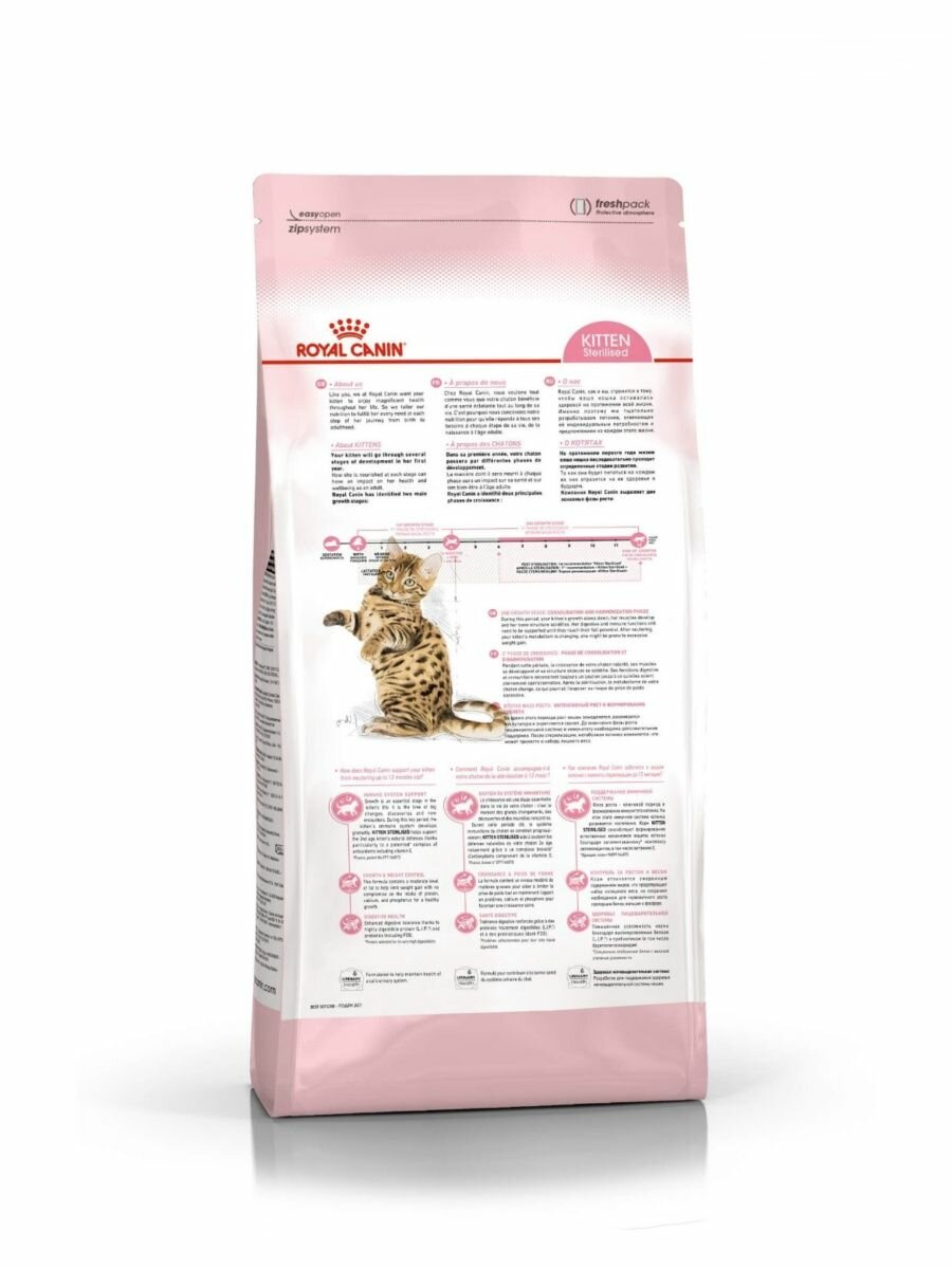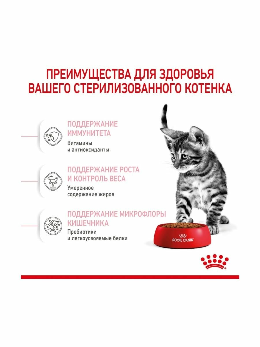 Royal Canin Kitten Sterilised. Сухой корм Роял Канин с мясом птицы предназначен для стерилизованных котят с момента операции до 12 месяцев всех пород. По ингредиентному составу относится к кормам суперпремиум класса. Содержит все витамины и минеральные вещества необходимые для повседневного здорового питания вашего питомца.