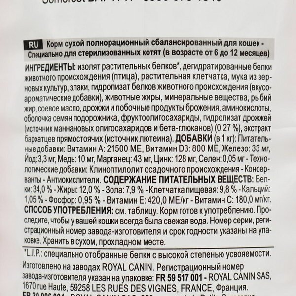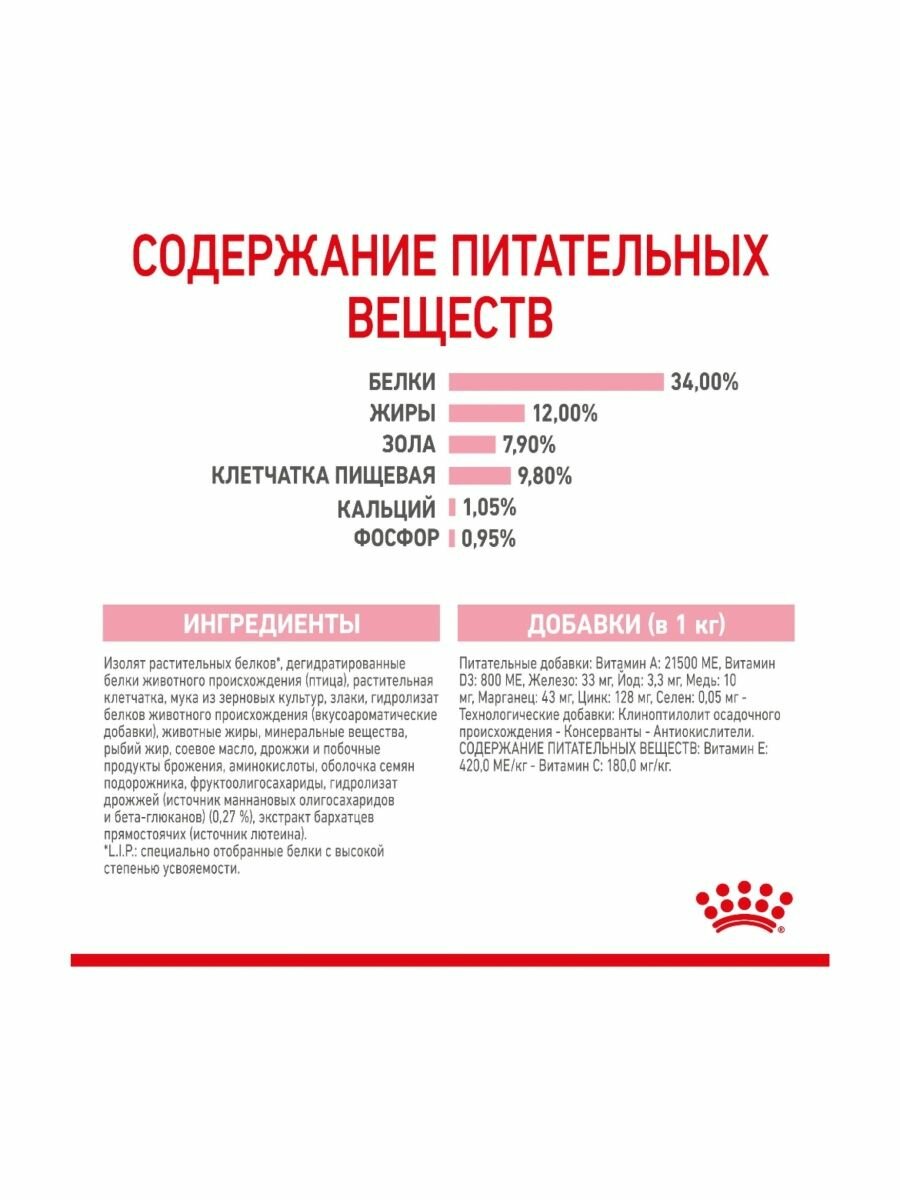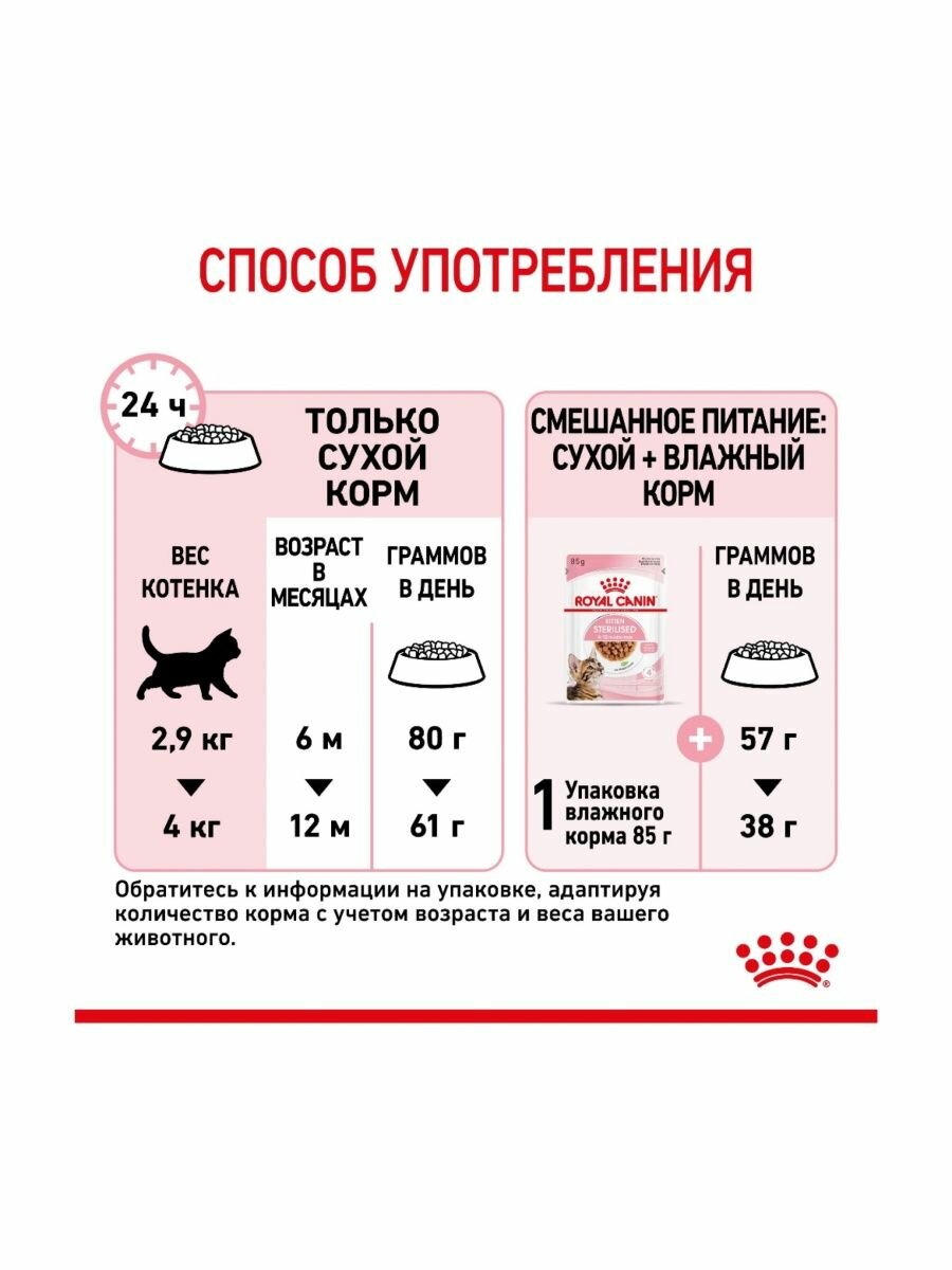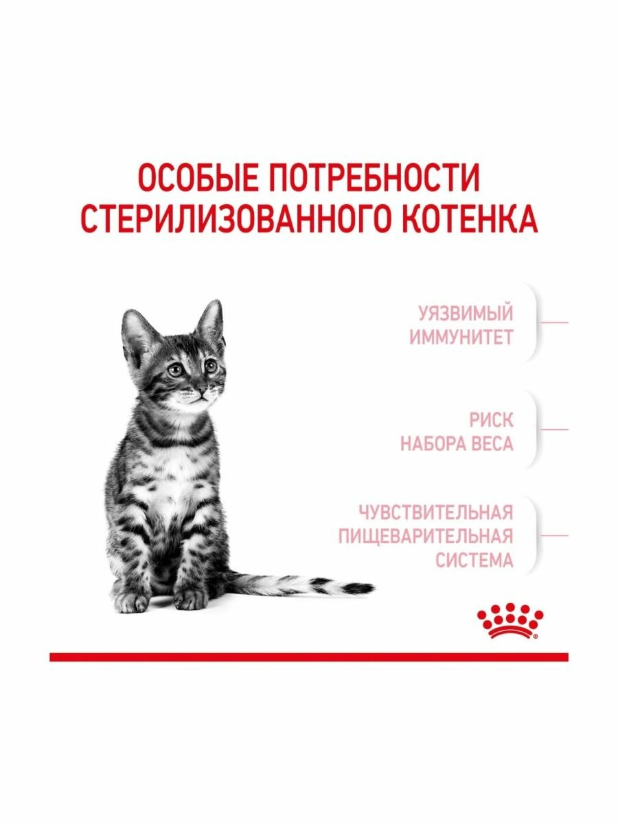 Royal Canin Kitten Sterilised. Сухой корм Роял Канин с мясом птицы предназначен для стерилизованных котят с момента операции до 12 месяцев всех пород. По ингредиентному составу относится к кормам суперпремиум класса. Содержит все витамины и минеральные вещества необходимые для повседневного здорового питания вашего питомца.