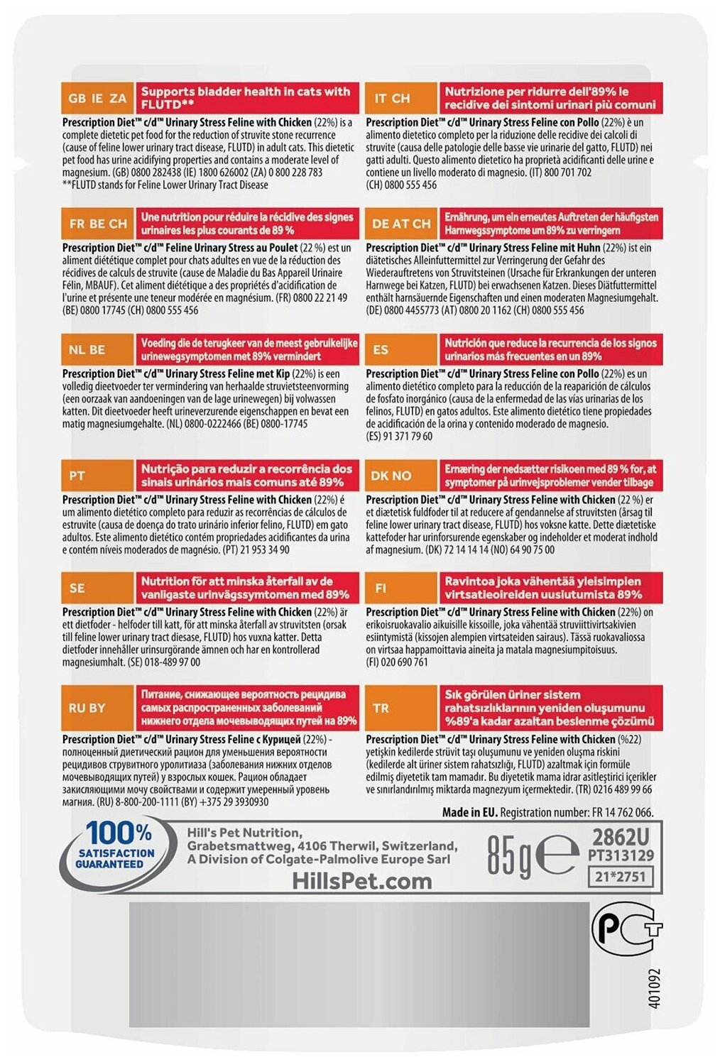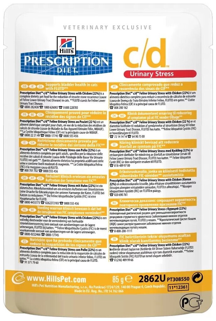 Prescription Diet™ c/d™ Feline Urinary Stress - полноценный диетический рацион для уменьшения вероятности рецидива заболеваний нижнего отдела мочевыводящих путей у кошек. - снижает вероятность повторного проявления признаков ИЦК на 89%*. - содержит L-триптофан и гидролизат молочного протеина для контроля стресса - основного фактора риска ИЦК. - растворяет струвиты уже через 14 дней*. - превосходный вкус, который понравится вашей кошке. Рекомендуемая продолжительность диетотерапии: до 6 месяцев Пробуете этот рацион впервые? Постепенно в течение 7 дней переводите животное на новый рацион, увеличивая его содержание по отношению к прежнему. Обеспечьте питомцу свободный доступ к свежей воде. Монодиета. Не требует дополнений. Перед началом применения и о длительности кормления проконсультируйтесь с ветеринарным врачом. Суточная норма кормления указана на упаковке и должна быть рассчитана в соответствии с размером животного, чтобы поддерживать оптимальный вес.
