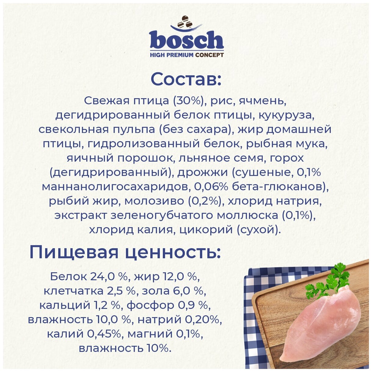 | Состав | Состав: Свежее мясо домашней птицы (25 %), рис, ячмень, мука из мяса домашней птицы, кукуруза, свекольная пульпа (без сахара), животный жир, гидролизованный белок, рыбная мука, яичный порошок, льняное семя, горох, дрожжи (дегидратированные, 0,1 % маннанолигосахариды, 0,06 % β-глюканы), рыбий жир, молозиво (0,3 %), хлорид натрия, экстракт зеленогубчатого моллюска (0,1 %), хлорид калия, порошок цикория. Белок 24,0 %, жир 12,0 %, клетчатка 2,5 %, зола 6,0 %, кальций 1,2 %, фосфор 0,9 %, влажность 10,0 %. Энергетическая ценность (ккал/100г): 373 ккал Пищевые добавки |