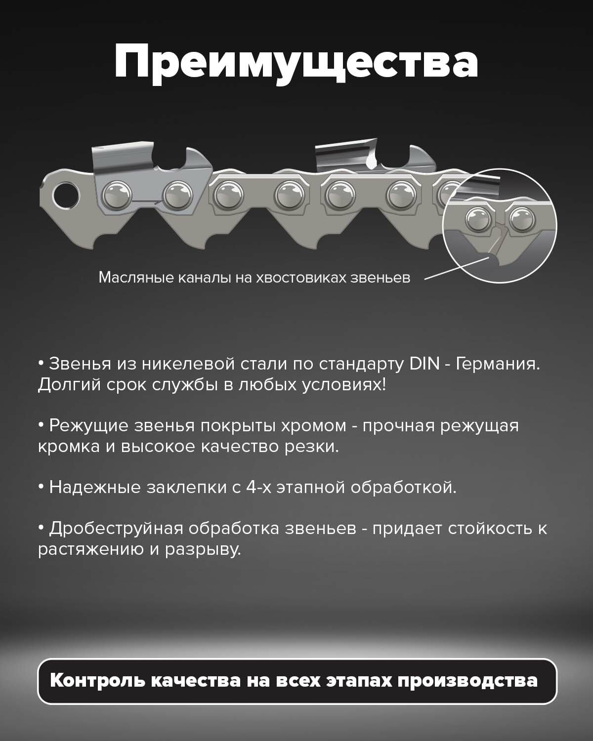 - Количество звеньев: 72, Количество режущих звеньев: 72, форма режущих звеньев: чизельный зуб