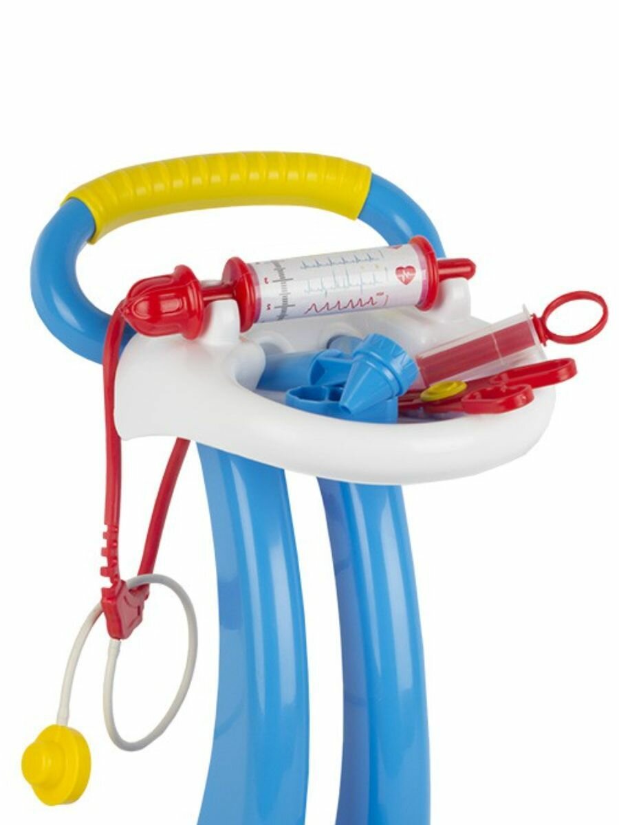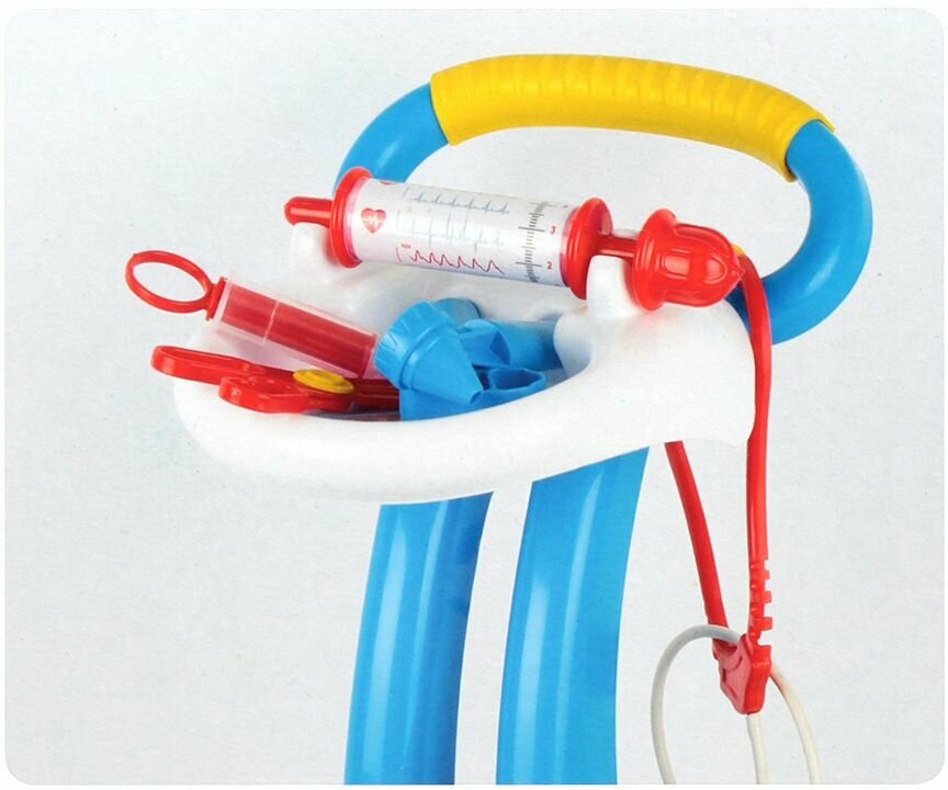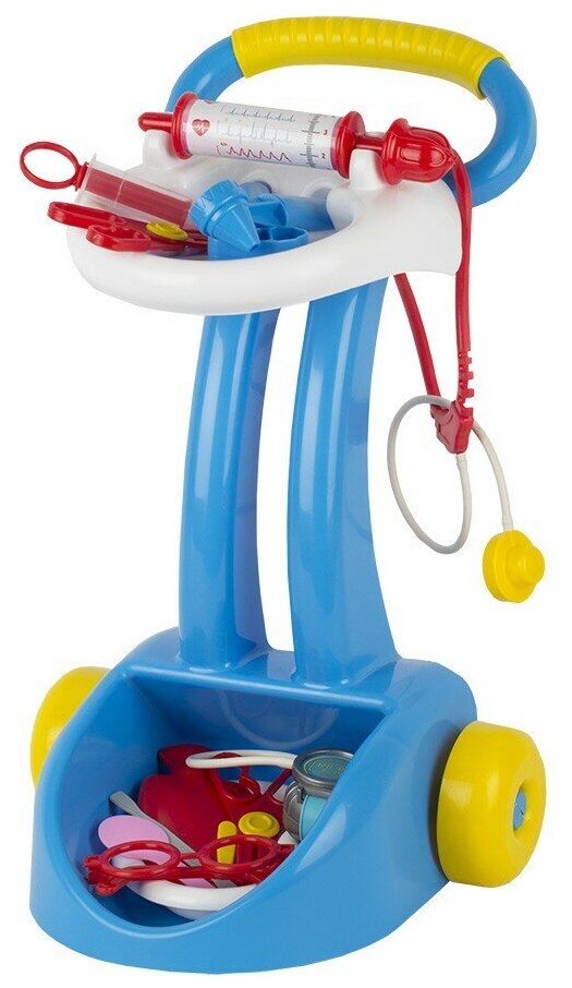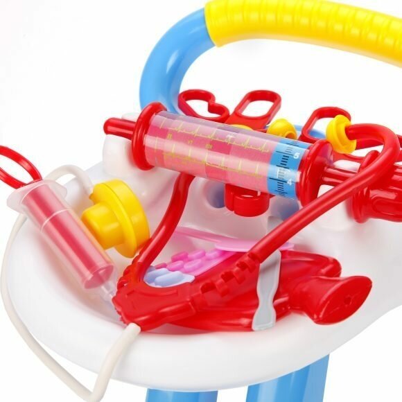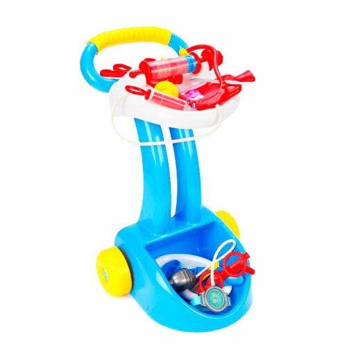 Совтехстром Игровой набор Маленький доктор (16 предметов) Набор маленького доктора в чемоданчике включает 16 предметов, предназначенных для увлекательной сюжетно-ролевой игры. Играя, ребёнок будет развивать воображение, навыки заботы о близких и коммуникативные способности. В комплект входят следующие игрушечные предметы: тележка, ванночка, скальпель, шприц, молоток, ларингоскоп, грелка, термометр, фонендоскоп, тонометр, ножницы, щипцы, очки, лопаточка окулиста и 2 таблетки. Размер тележки в собранном виде - 28х34х46 см. Игрушки изготовлены из пластмассы.