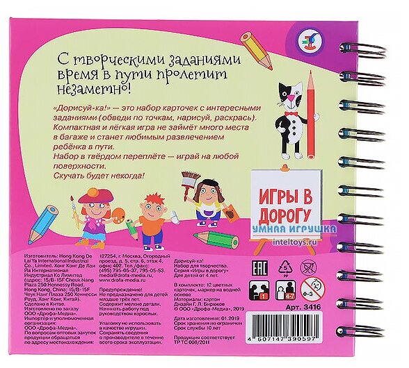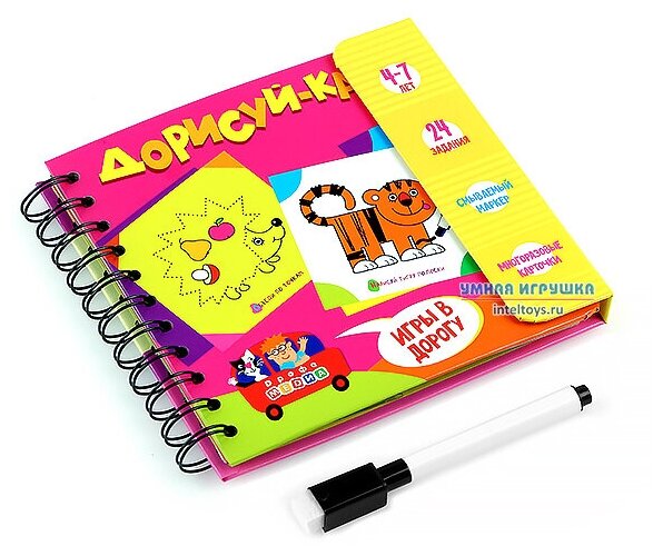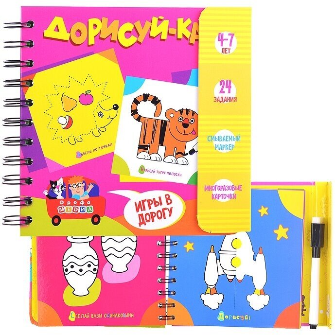 Дети, путешествие и дорожная игра Дорисуй-ка! — идеальное сочетание! В наборе 24 интересных творческих задания (обведи по точкам, нарисуй, раскрась). Компактный и лёгкий блокнот не займёт много места в багаже и станет любимым развлечением ребёнка в пути. Твёрдый переплёт позволит играть на любой поверхности. Да, карточки многоразовые — можно стирать нарисованное и рисовать новое без конца!