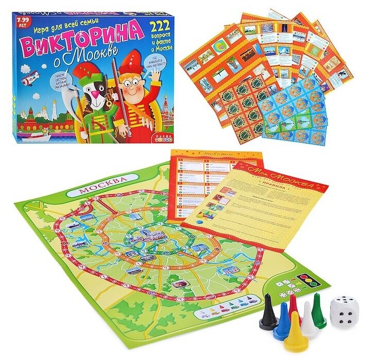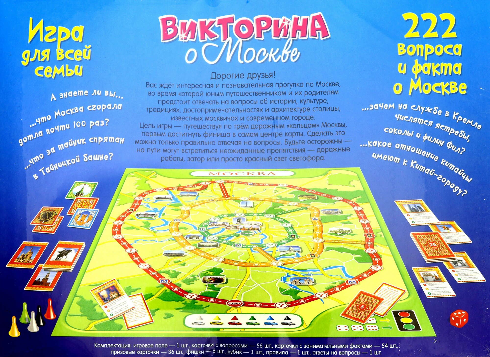Вас ждёт занимательное путешествие по Москве, во время которого юным москвоведам, а также их родителям предстоит отвечать на вопросы об их истории, культуре, традициях, достопримечательностях и архитектуре столицы, известных москвичах и современном городе. Цель игры — путешествую по трем дорожным «кольцам» Москвы, первым достигнуть финиша в самом центре карты. Сделать это можно только правильно отвечая на вопросы. Будьте осторожны — на пути могут встретиться неожиданные препятствия, например дорожные работы, затор или просто красный свет светофора.