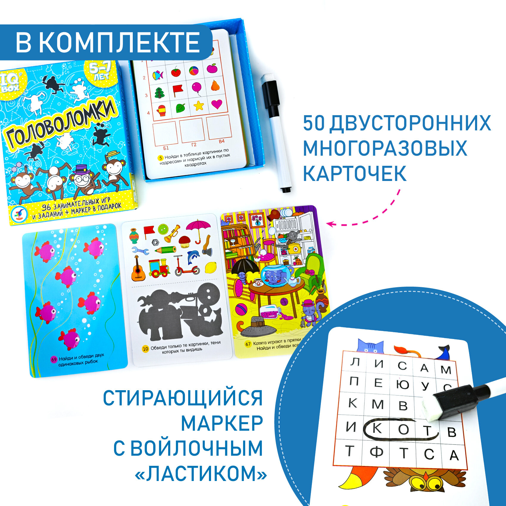 | Комплектация | 50 двусторонних карточек с закруглёнными безопасными краями и смываемый фломастер |