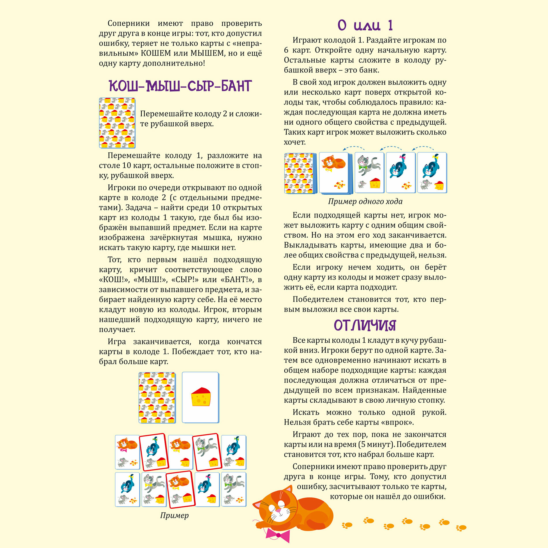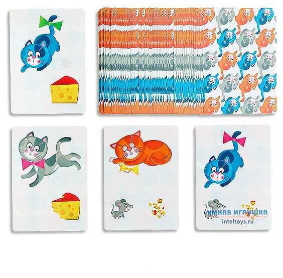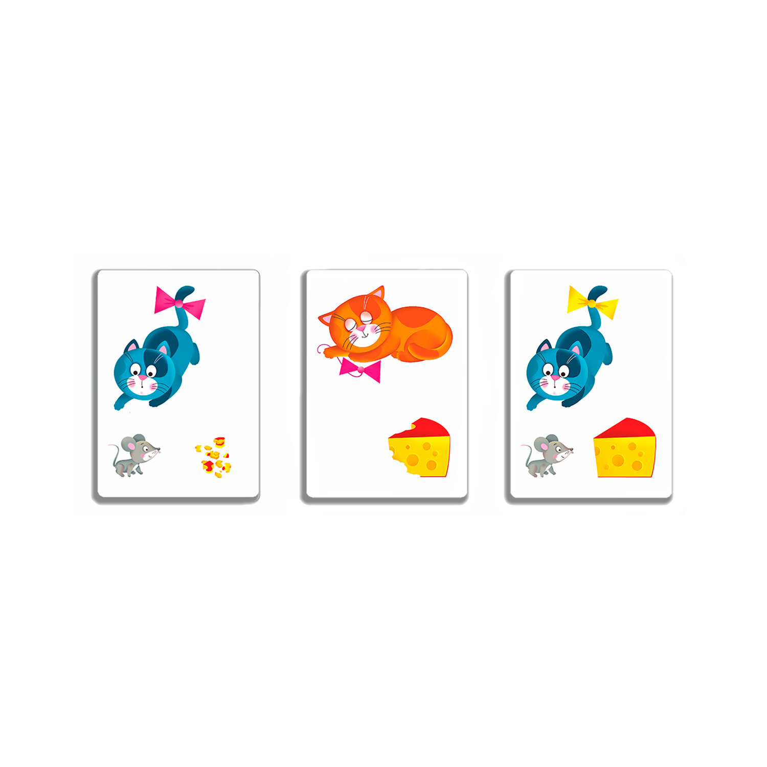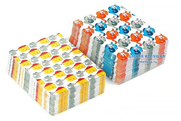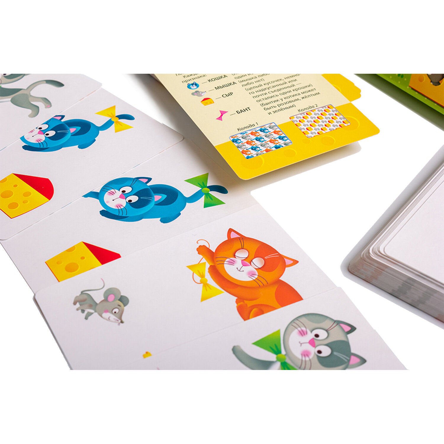 Что делать, если в доме завелись мышки, которые очень любят полакомиться сыром? Завести кота! А ещё лучше — трёх. Только вот кто окажется шустрее — кошки или мышки? Эта игра поможет обнаружить самого бдительного и проворного охотника на мышек, котов, бантики и даже сыр! В небольшой коробочке вы найдёте 100 карт (включая правила), с которыми можно провести 5 разных игр — простые и сложные, на логику и внимание. Игра учит выделять отдельные свойства предметов и комбинировать их (например, цвет кота или его бантика, наличие или отсутствие мышки, изгрызенность сыра). Играйте на вечеринке, дне рождения, в дороге! Глядите в оба!