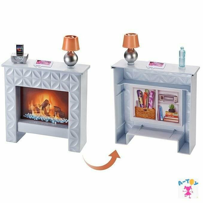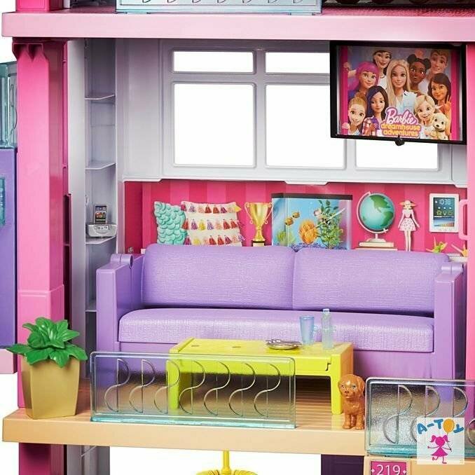 С этим домом мечты для Барби вы оцените все преимущества современной жизни. Размеры дома 120 см в высоту и 125 см в ширину, в нем 3 этажа, 8 комнат, работающий лифт, бассейн с горкой и задействован каждый угол для игры. Здесь есть все необходимое для дома мечты. В лифте дома мечты может ехать сразу 4 куклы и из него можно попасть сразу в комнату. Также к особенностям можно отнести рабочий кабинет, гараж для автомобиля, и бассейн на втором этаже с горкой, которая начинается на третьем этаже. Для получения эффекта настоящих брызг наполните бассейн водой. Свет и звуки добавляют реалистичности и способствуют ролевой игре, например, поставьте сковородку на плиту и нажмите на нее – вы услышите шипение как у настоящей сковороды. Сделайте то же самое с чайником, чтобы услышать свист, откройте духовку, чтобы увидеть свет в ней, поверните таймер на духовке, и он начнет тикать, и нажмите кнопку на бачке, и вы услышите звук смыва. Трансформирующаяся мебель также расширяет возможности для игры: диван превращается в двухъярусную кровать, а журнальный столик переворачивается и становится кроваткой для куклы Челси (продается отдельно) и создает дополнительную спальню для гостей. Камин разворачивается и превращает уютное жилище в домашний офис, кухонная раковина выполняет сразу две роли – с одной стороны у нее барбекю и полки, а с другой стороны – плита и мусорный контейнер, и задняя сторона холодильника становится напольной стойкой для еды.