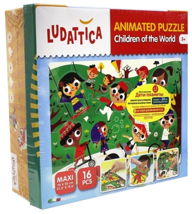 В паззл вставляются фигурки персонажей, которым ребенок может придавать разные выражения лиц. Игра развивает мелкую моторику, воображение. Состав набора: 12 деталей паззла, 6 фигур детей, 20 самоклеящихся глаз. Размер собранного паззла: 70х50 см. Возраст: от 3 лет. Размер коробки: 27,5х27,5х10 см Продукт разработан в Италии, в Центре Исследований и Разработки Lisciani.