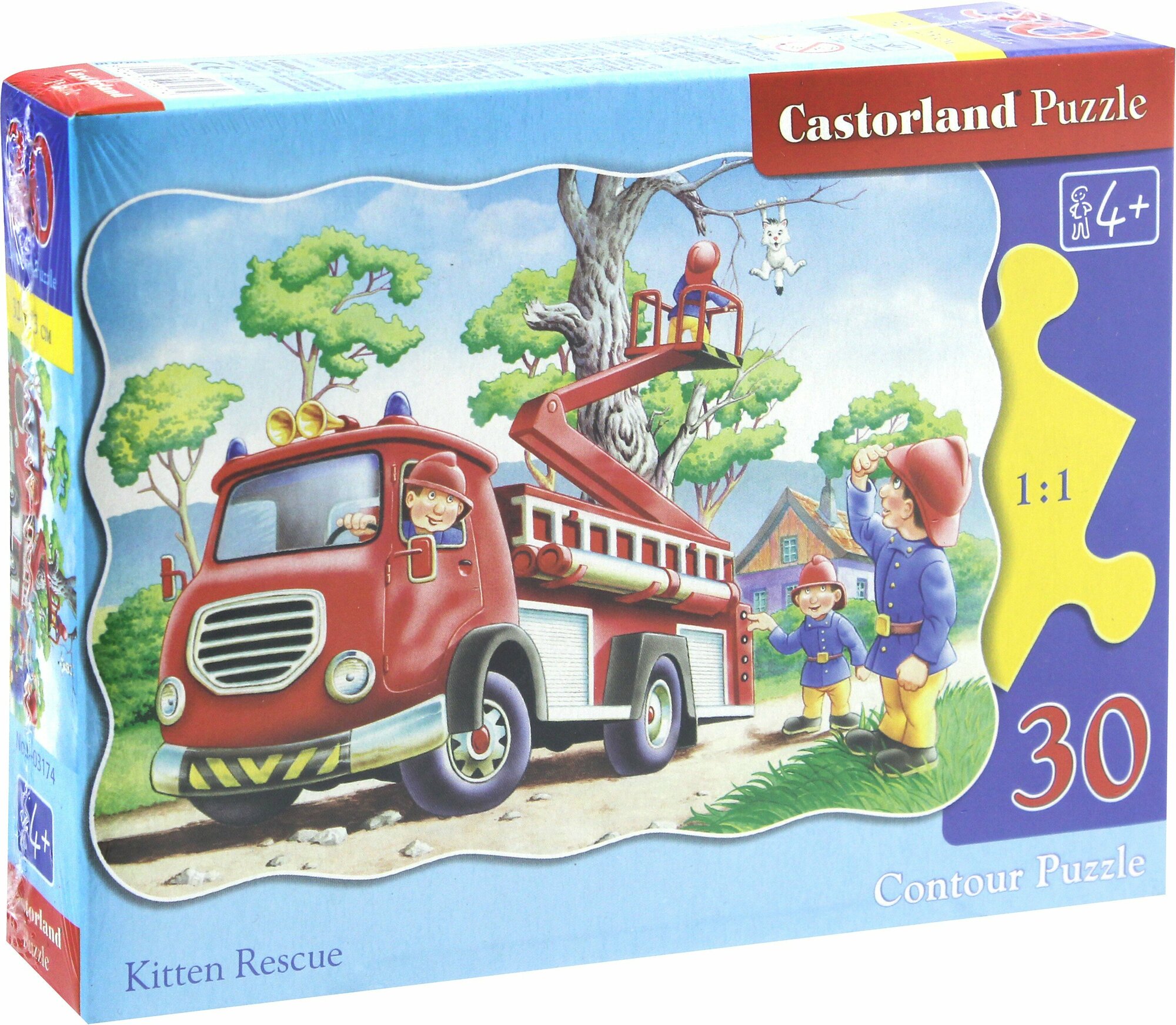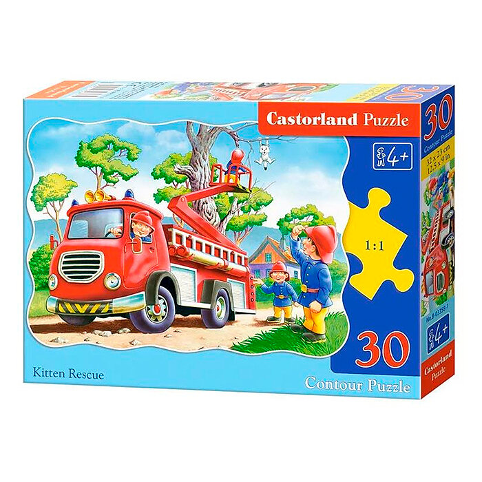 Элементы детского макси-пазла Спасение котенка от компании Castorland складываются в яркую картинку с изображением большой пожарной машины и 4 пожарных в форме, которые пытаются спасти белого котенка, застрявшего на дереве. Все детали головоломки, выполненные из прочного картона, легко соединяются друг с другом.