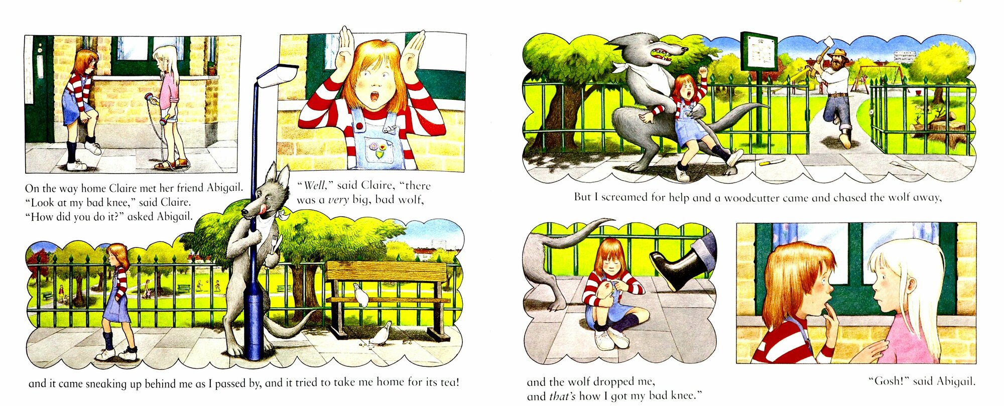 Claire has hurt her knee so she sets off home to tell her mum all about it. On the way she meets her friends and tells them how the fall happened. But just how did it happen...? Was she dropped by a wolf, a slithering snake, an enormous dragon or a hairy gorilla?!