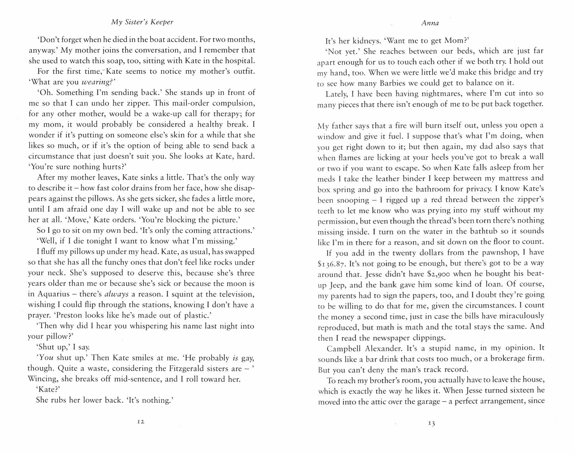 Очень интересная и необычная история. Джоди Пиколт любит в своих романах поднимать серьезные темы. В данном случае затрагивается тема тяжелой болезни одной сестры и необходимость все время сдавать анализы, проходить тяжелые операции другой сестре, чтобы помочь. Но Анна больше не хочет быть ангелом для своей сестры и подает на родителей в суд, чтобы самой распоряжаться своей жизнью и решать, нужно ей отдавать почку и идти на другие операции или нет. Интересно, что повествование истории ведется сразу от нескольких лиц, а именно от самой Анны, которая в свои 13 лет решила подать в суд на родителей, от её сестры Кейт, которая умрет, если она не согласится на операцию, от лица родителей девочек и даже от лица адвоката Анны. Здесь нет плохих или хороших людей. У каждого из героев своя правда, каждый старается сделать как лучше, но при этом неизбежно вредит кому-то другому. Даже у адвоката Кэмпбелла есть своя тайна и своя история, которую он ото всех тщательно скрывает. Джоди Пиколт любит поднимать в своих романах спорные темы, а также описывать заседания в зале суда. Здесь без этого тоже не обошлось. Несмотря на то, что роман достаточно тяжелый, так как одна из главных героинь здесь больна лейкемией, есть в нем и жизнеутверждающие моменты. А вот финал меня очень удивил. Джоди Пиколт решила показать, что человек может бороться за свое будущее, планировать его, мечтать, но в итоге все решит случай.