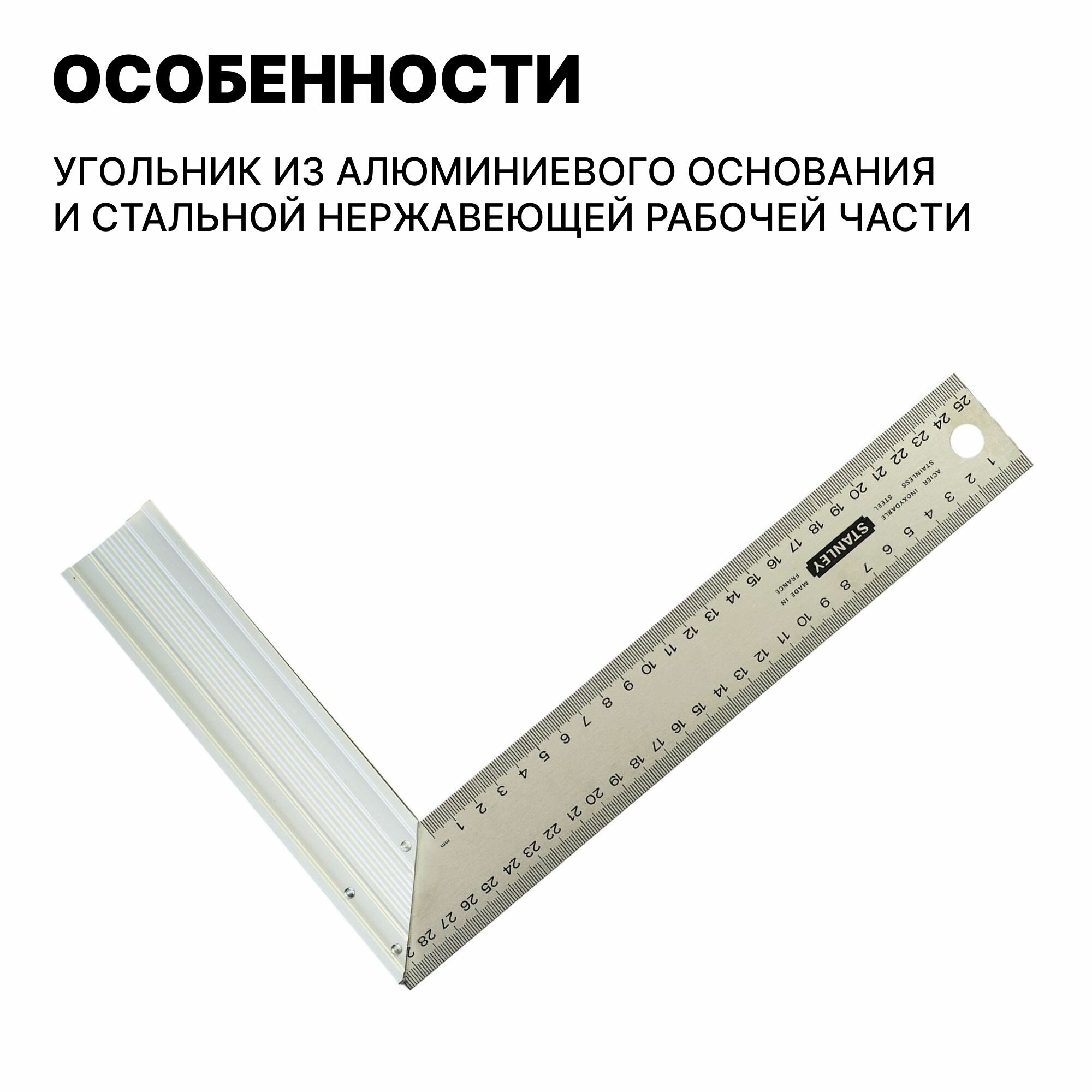 Угольник Stanley предназначен для проведения столярных работ - точного измерения различных поверхностей и деталей. Инструмент сочетает в себе алюминиевое основание и мерительное полотно из нержавеющей стаи. Шкала легко читается, она глубоко выгравирована по технологии "GRAVEMAT", что снижает уровень ее истирания даже при частом и интенсивном использовании угольника.