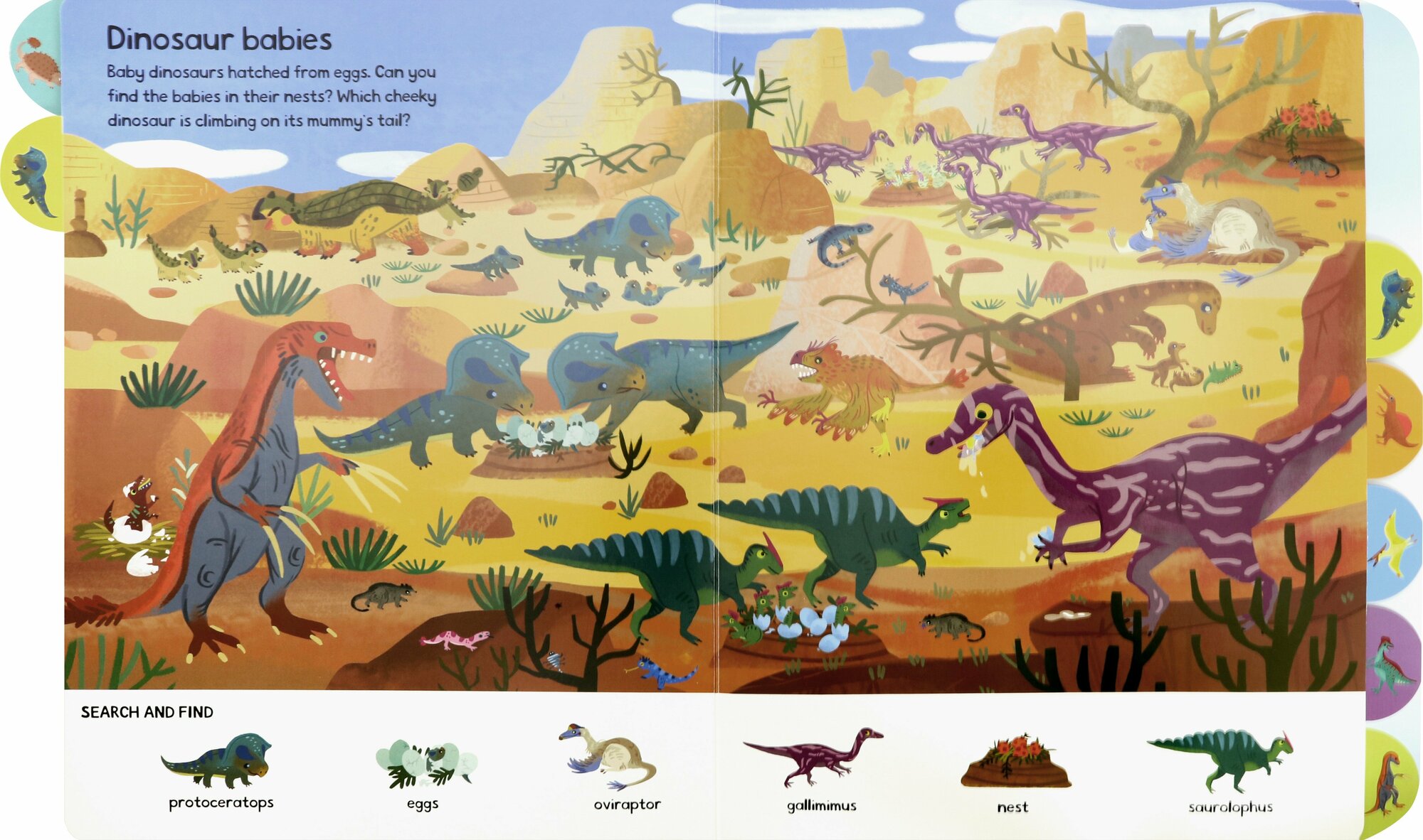 There are seven themed scene: forest, dinnertime, desert, swamp, the coast, volcanic eruption and prehistoric museum - with sturdy tabs for young children to find their favourite pages. Children can then explore the big scenes, find the dinosaurs and read the name labels in the panels. With a baby dinosaur to spot in each scene, there is plenty here for parents and children to talk about and return to again.