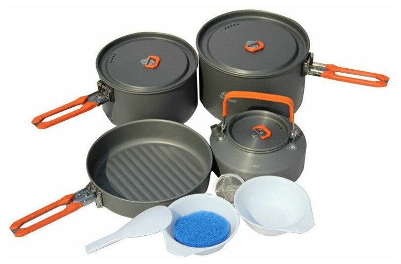 | Комплектация | миска (2 шт.), лопатка, котелок (2 шт.), сковорода, чайник, губка для мытья посуды, мешочек для транспортировки |