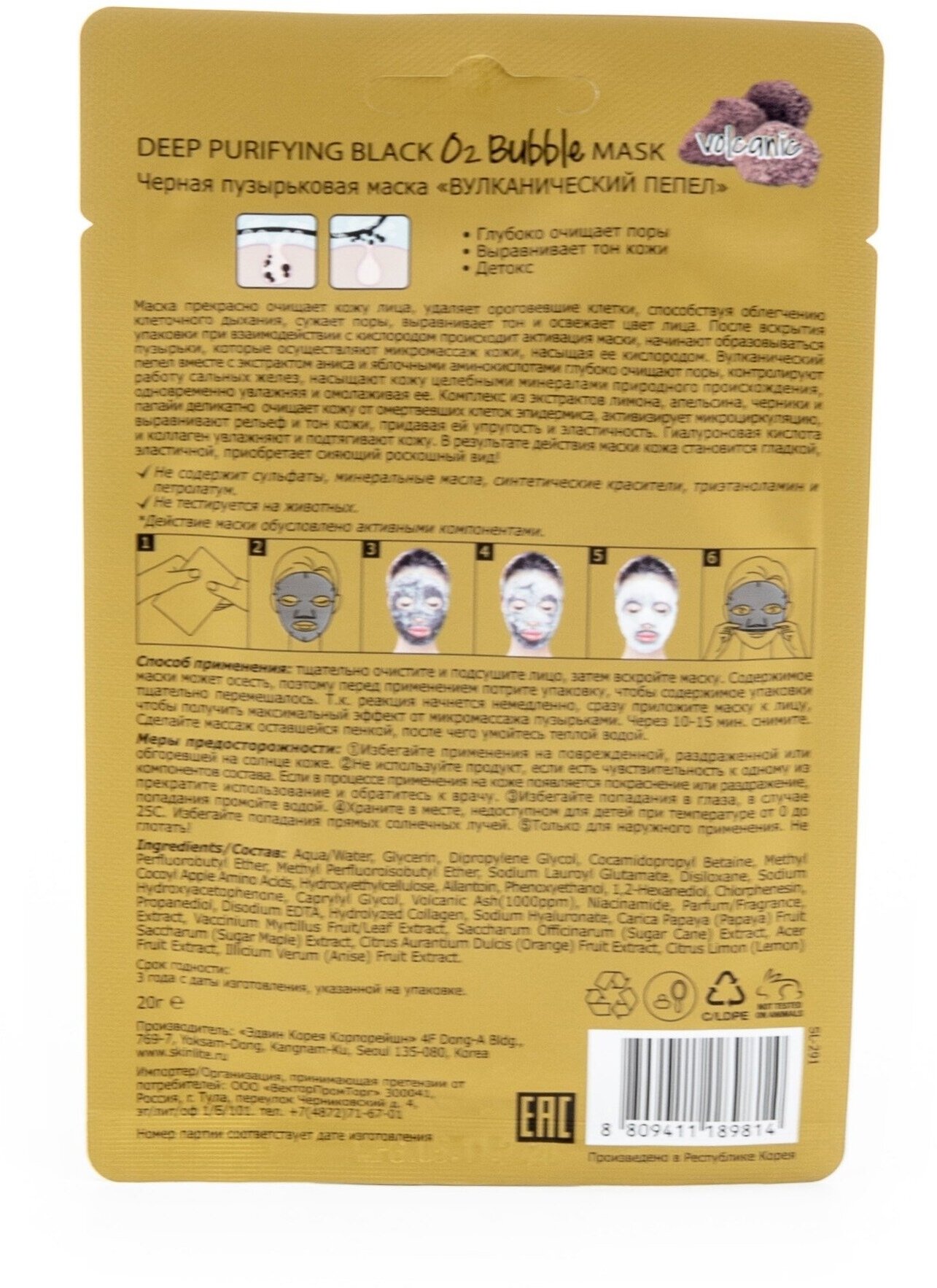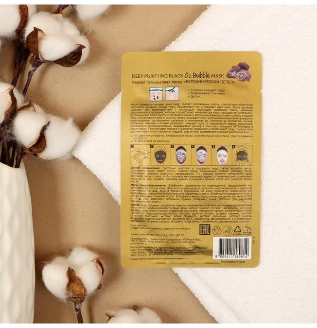 После вскрытия упаковки при взаимодействии с кислородом происходит активация маски, начинают образовываться пузырьки, которые осуществляют микромассаж кожи, насыщая ее кислородом.