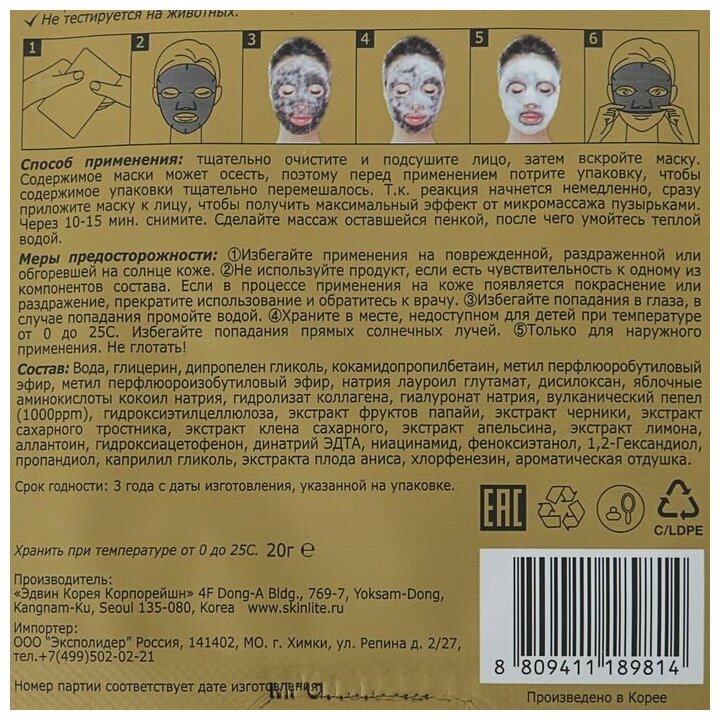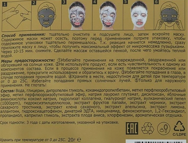 | Способ применения | Тщательно очистите и подсушите лицо, затем вскройте маску. Содержимое маски может осесть, поэтому перед применением потрите упаковку, чтобы содержимое упаковки тщательно перемешалось. Реакция начнется немедленно, сразу приложите маску к лицу, чтобы получить максимальный эффект от микромассажа пузырьками. Через 10-15 мин. снимите. Сделайте массаж оставшейся пенкой, после чего умойтесь теплой водой. |