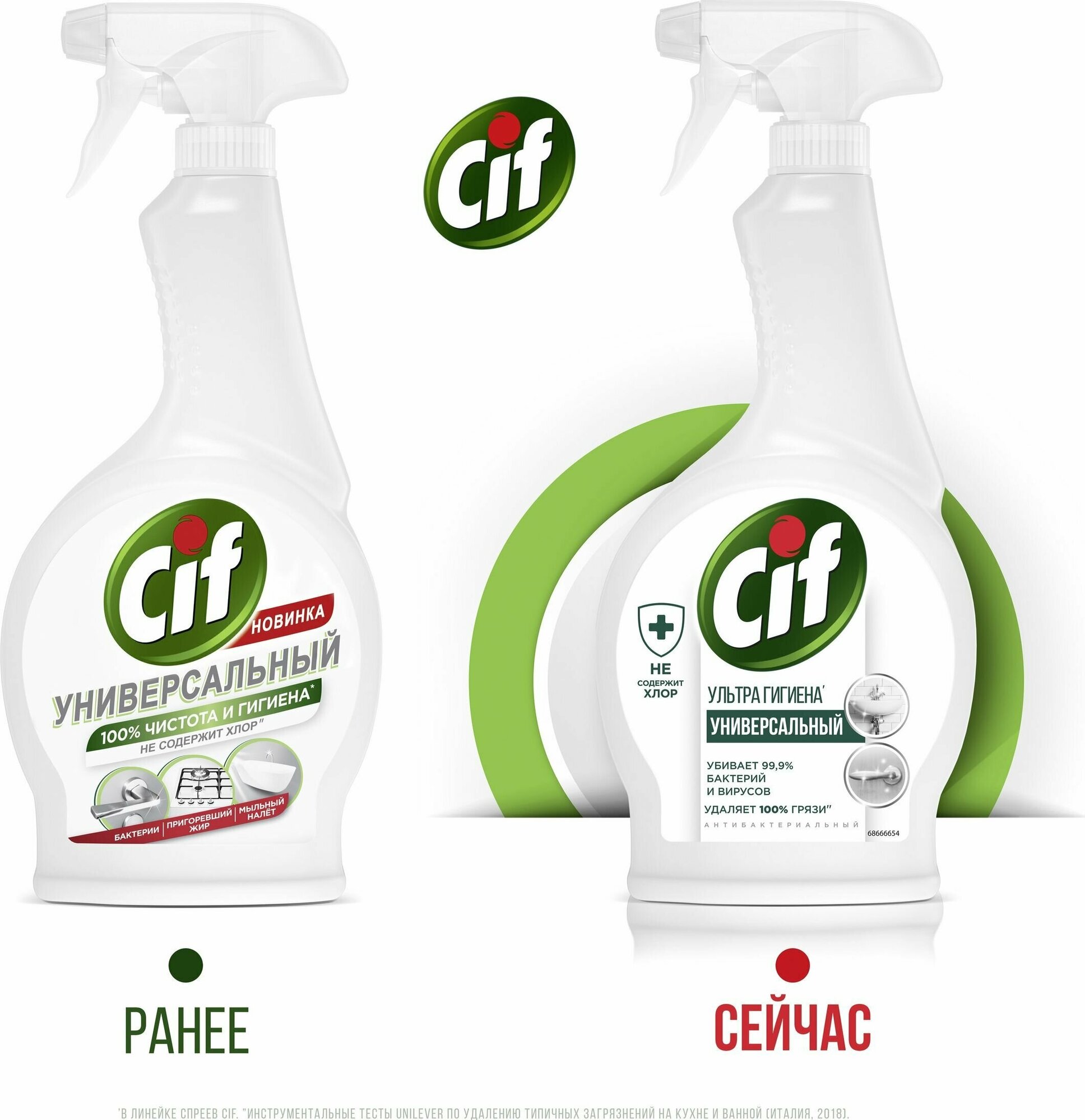Спрей чистящий CIF Универсальный Антибактериальный удаляет 99,9% бактерий. Средство удаляет даже въевшуюся грязь, обеспечивает блеск поверхностей без разводов.