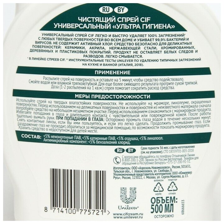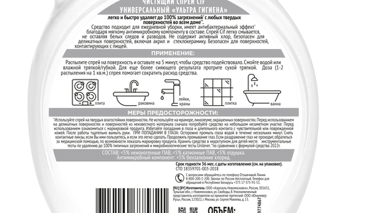 | Способ применения | Чистящий спрей Универсальный Антибактериальный обеспечивает эффективное очищение всех поверхностей в доме, а также устраняет 99,9% бактерий*. Спрей не содержит хлор**. Спрей начинает действовать мгновенно, проникая вглубь и растворяя жир, масло, остатки пищи, пригоревшую еду, мыльный и известковый налет. После этого всю грязь вместе со спреем можно просто и быстро смыть. Спрей не оставляет разводов и следов. Буквально через несколько секунд Вы можете стереть грязь и насладиться блестящими, ухоженными поверхностями и приятным ароматом! Чистота и сияние поверхностей – легко! Инновационная формула спрея Cif помогает легко и быстро отчистить грязь с поверхностей. Подходит для удаления кухонных загрязнений (жирные пятна, пригоревшая еда), загрязнений в ванной (мыльный и известковый налет), очищения и обработки других твердых поверхностей в доме. Обладает дезинфицирующим эффектом, убивает до 99.9% бактерий*, оставляя поверхности гигиенически чистыми. Распылите спрей на поверхность. Спрей Cif моментально удалит загрязнения. Протрите поверхность тряпкой - для блеска поверхности без разводов! Раз-два-три – и готово! Cif даёт вам больше времени для жизни! Для удаления трудновыводимых загрязнений не смывайте средство в течение 1 минуты. Для ещё более сияющего результата протрите поверхность сухой тряпкой. Перед применением обязательно прочтите инструкцию и соблюдайте осторожность при использовании средства. *Чистящее средство с дезинфицирующим эффектом при действии минимум 5 минут (тесты Unilever,2012) **Чистящее средство без активного хлора. |