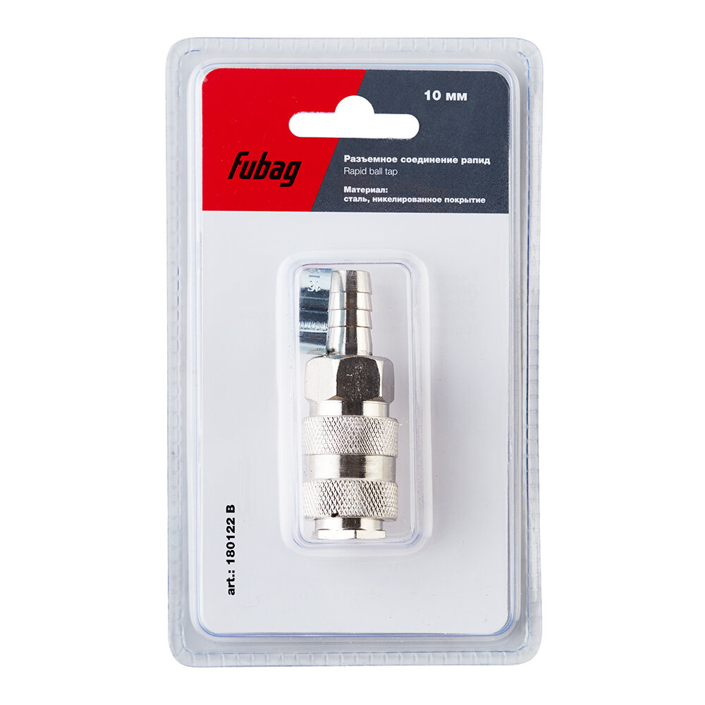 Переходник рапид — "елочка" FUBAG используется совместно с компрессорным оборудованием для соединения шланга с пневмоинструментом. Внутренний диаметр подсоединяемого шланга — 10 мм. Крепится к инструменту с помощью соединения рапид, а к шлангу — "ёлочкой". В комплекте поставляется обжимное кольцо — 10х15 мм. Созданная конструкция обладает высокой надежностью и герметичностью. Поставляется в фирменной упаковке - "блистере".
