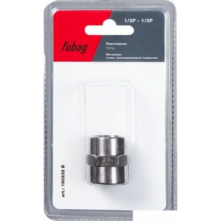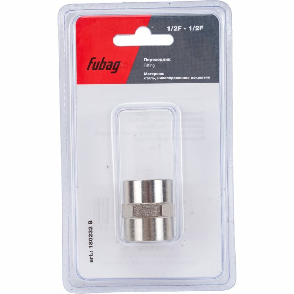 Переходник Fubag предназначен для соединения выхода компрессора со шлангом пневмоинструмента. Преимущества Надёжное и герметичное соединение обеспечивается металлической конструкцией и резьбовыми соединениями Простота подключения.Обеспечивает переход с резьбы 1/2" (внутренняя) на резьбу 1/2" (внутренняя), что позволяет легко и быстро подключить его к компрессору или пневмоинструменту Современный дизайн. Переходник имеет крепкий корпус и отлично функционирует Поставляется в удобном блистере, что облегчает хранение и транспортировку