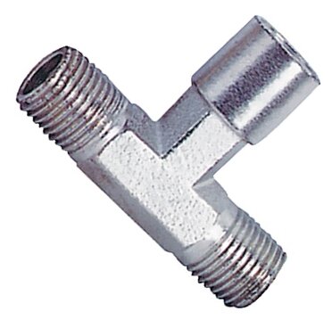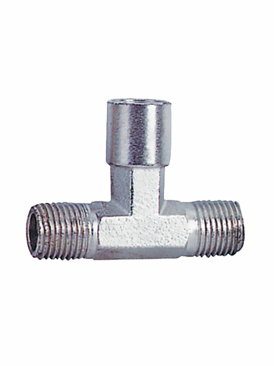 T-образный переходник (тройник) позволяет подсоединить к пневмомагистрали дополнительный участок. Крепление - резьба 3/8". Поставляется в блистере.