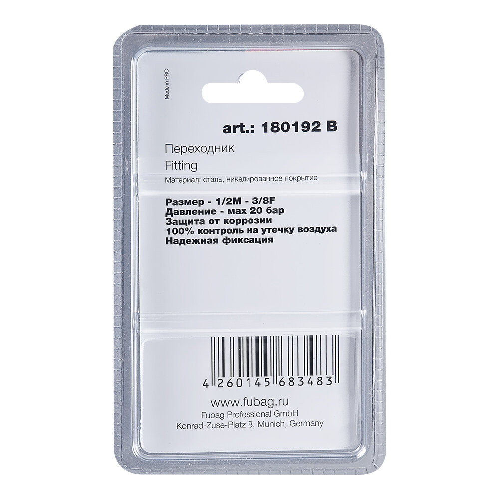 Переходник Fubag предназначен для соединения выхода компрессора со шлангом пневмоинструмента. Преимущества Надёжное и герметичное соединение обеспечивается металлической конструкцией и резьбовыми соединениями Простота подключения. Переходник оснащён внешней резьбой 1/2" (папа) на входе и внутренней резьбой 3/8" (мама) на выходе, что позволяет легко и быстро подключить его к компрессору или пневмоинструменту Современный дизайн. Переходник имеет крепкий корпус и отлично функционирует Поставляется в удобном блистере, что облегчает хранение и транспортировку