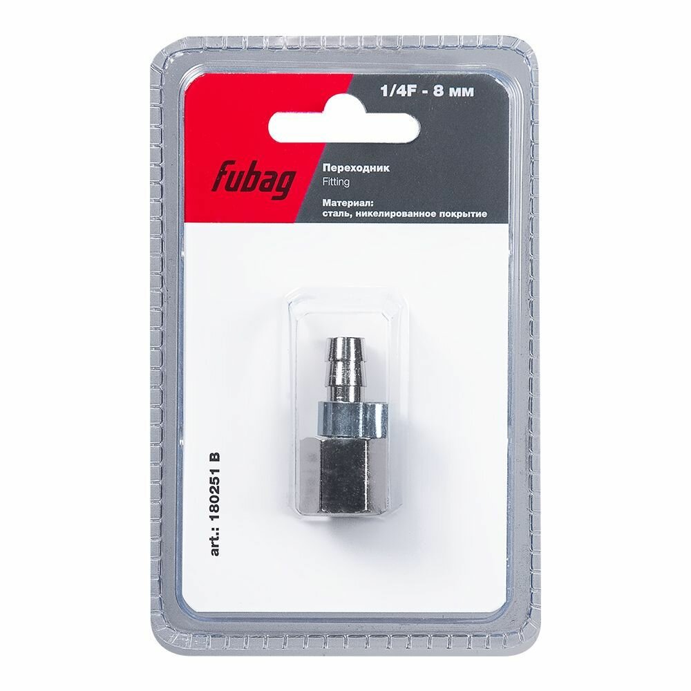 Переходник FUBAG используется совместно с компрессорным оборудованием для соединения шланга с пневмоинструментом. Крепится к инструменту с помощью резьбового соединения 1/4"F к шлангу - "елочка" (8 мм) В комплекте поставляется обжимное кольцо — 8х13 мм.