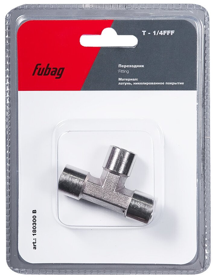 Переходник T — образный FUBAG B предназначен для разветвления пневмомагистрали и для подсоединения к ней дополнительного участка системы. Крепление осуществляется с помощью резьбы 1/4". Созданная конструкция обладает высокой надежностью и герметичностью. Поставляется в блистере.