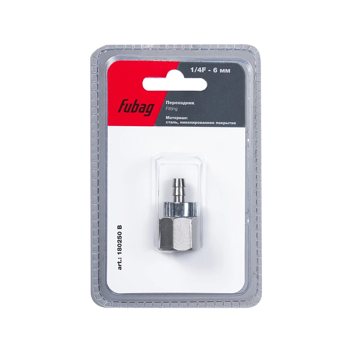 Переходник FUBAG используется совместно с компрессорным оборудованием для соединения шланга с пневмоинструментом. Крепится к инструменту с помощью резьбового соединения 1/4"F к шлангу - "елочка" (6 мм) В комплекте поставляется обжимное кольцо — 6х11 мм.