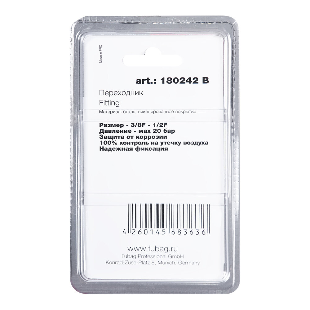 Переходник Fubag предназначен для соединения выхода компрессора со шлангом пневмоинструмента. Преимущества Надёжное и герметичное соединение обеспечивается металлической конструкцией и резьбовыми соединениями Простота подключения.Обеспечивает переход с резьбы 3/8" (внутренняя) на резьбу 1/2" (внутренняя), что позволяет легко и быстро подключить его к компрессору или пневмоинструменту Современный дизайн. Переходник имеет крепкий корпус и отлично функционирует Поставляется в удобном блистере, что облегчает хранение и транспортировку
