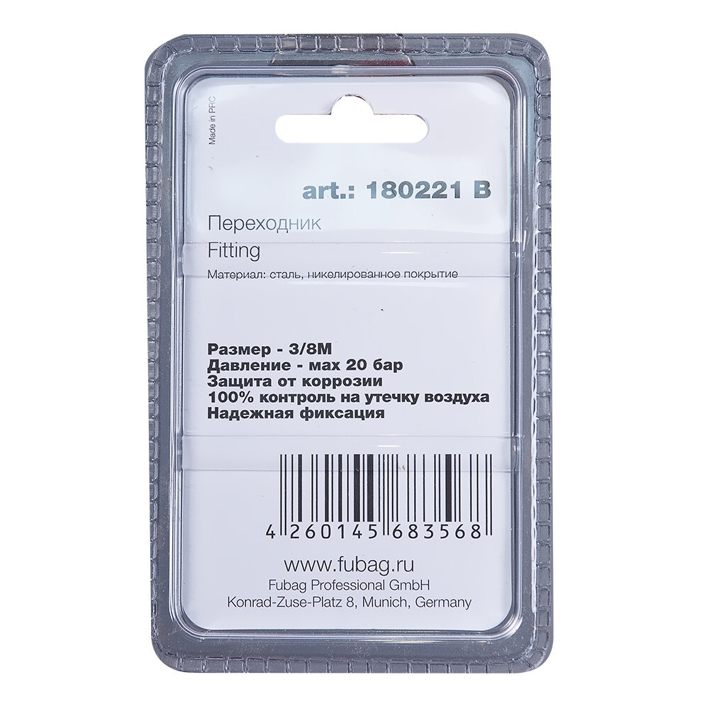 Заглушка FUBAG 180221 В предназначена для перекрывания отдельного участка пневмомагистрали и для закрывания концевого отверстия. Крепление осуществляется с помощью наружной резьбы 3/8". Созданная конструкция обладает высокой надежностью и герметичностью. Поставляется в блистере.