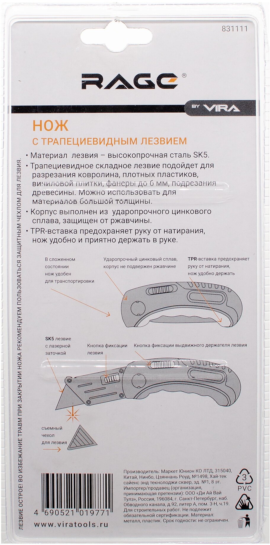 **Нож Vira 19 мм складной** с цельнометаллическим корпусом из алюминия с антикоррозийный цинковым покрытием. Рукоятка повторяет изгиб ладони. Пальцы не натираются т.к. часть рукоятки изготовлена из TPR резины. Винты на корпусе ножа сохраняют затяжку при ударах и падении с высоты 10 метров. Трапециевидное мини-лезвие из стали SK5 фиксируется в раскладном держателе размером 19*61 мм. Держатель лезвия исключает его самопроизвольное выпадение. Лезвие подрезает древесину, разрезает ГВЛ, ковролин, пластик, виниловую плитку и фанеру до 6 мм. Лазерная заточка кромки сохраняет остроту рабочей поверхности. Лезвие безопасно раскрывается без автоматического выброса держателя. Нож поместится в карман т.к. его длинна в сложенном состоянии 9,5 см это на 1 см больше длины кредитной карты. Съёмный чехол для мини-лезвия предотвращает случайные порезы.