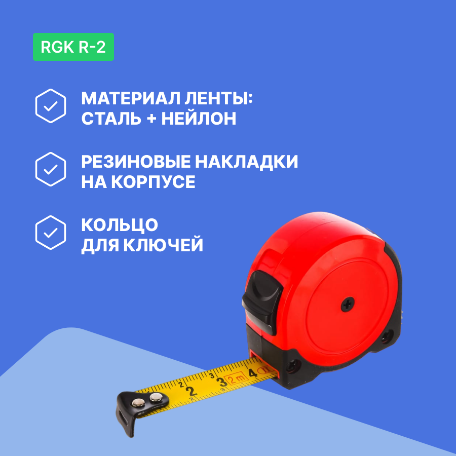 Измерительная рулетка RGK R-2 со стальной лентой длиной 2 метра выполнена в компактном ударопрочном корпусе и имеет кольцо для ключей. Небольшие размеры позволяют хранить рулетку в ящике с инструментами.