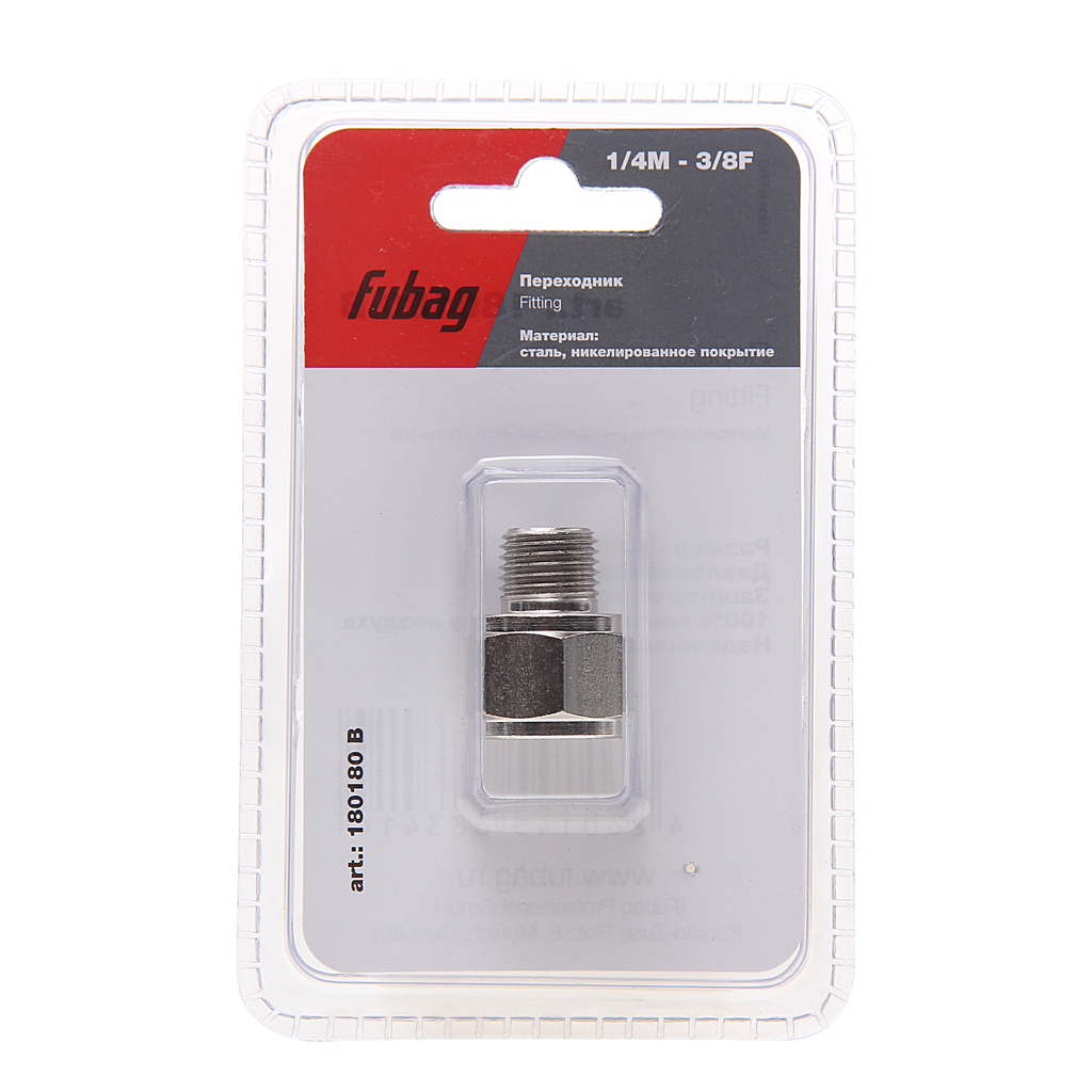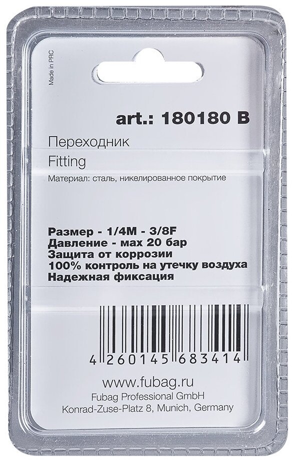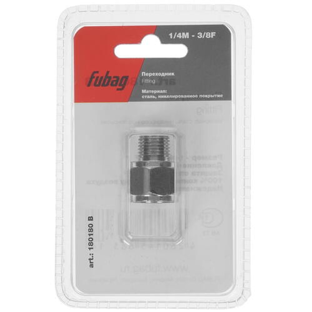 Переходник Fubag предназначен для соединения выхода компрессора со шлангом пневмоинструмента. Преимущества Возможность использовать с различными инструментами и шлангами- внешняя 1/4"(папа) и внутренняя 3/8"(мама) Поставляется в блистере тем самым обеспечивает удобство хранения и транспортировки Надежное и герметичное соединение гарантирует безопасность и эффективность работы Переходник изготовлен из прочной стали что обеспечивает долговечность и устойчивость к коррозии. Прямой тип формы переходника обеспечивает удобство и простоту работы Переходник оснащён резьбовыми соединениями и это дает возможность легко и быстро подключать и отключать шланги и инструменты