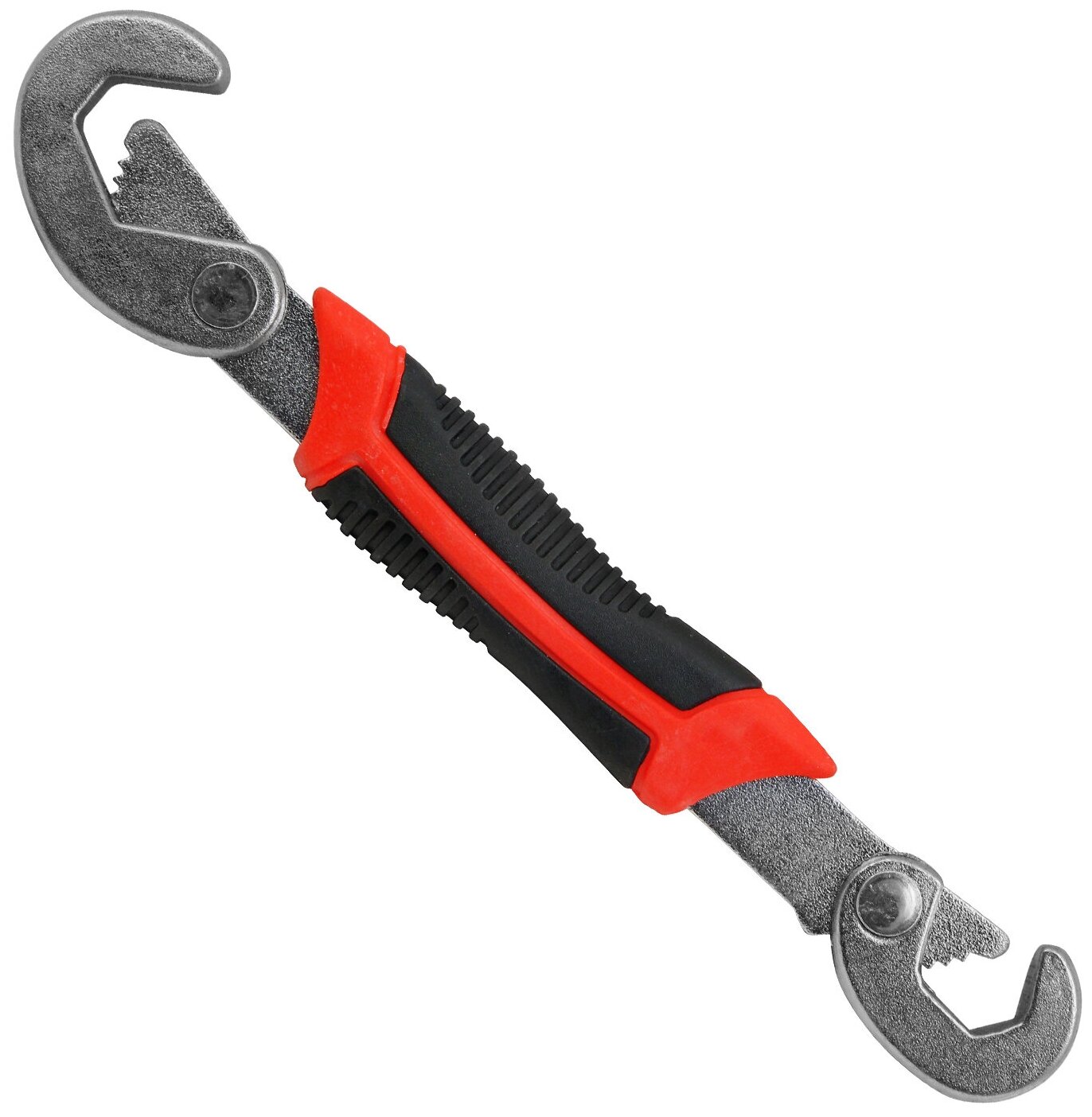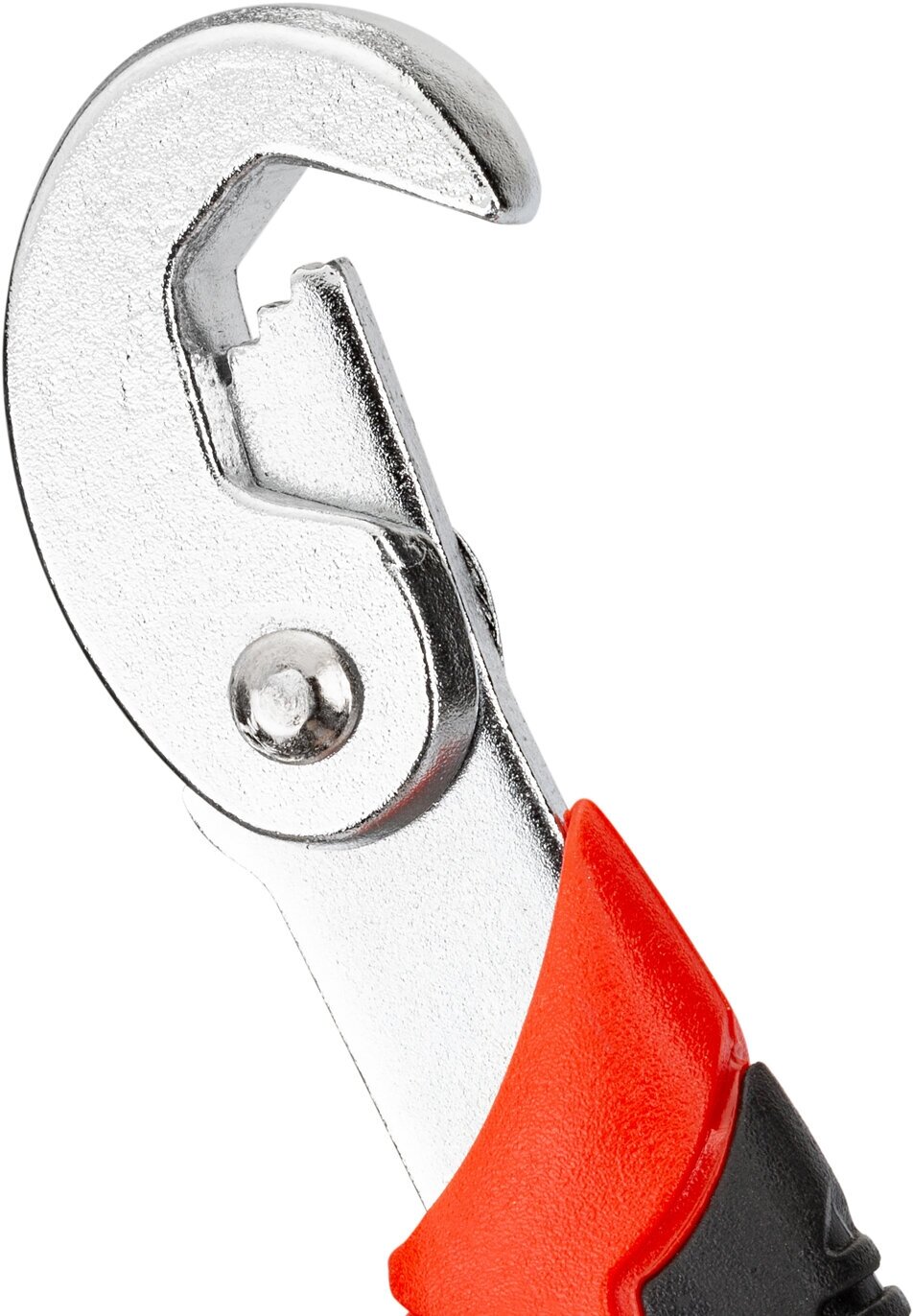 Двусторонний ключ из высокоуглеродистой стали с пластиковой рукояткой. С одной стороны находится малый подвижный крюк с рабочим ходом 9-13 мм; а с другой - большой подвижный крюк 13-22 мм. Инструмент предназначен для закручивания болтов и гаек с 4,6,12 гранями. Адаптирован для захвата круглых труб и прутьев, в том числе с квадратным сечением. Является альтернативой наборам ключей в доме: один инструмент проще хранить, чем целый комплект, легко переносить с собой.