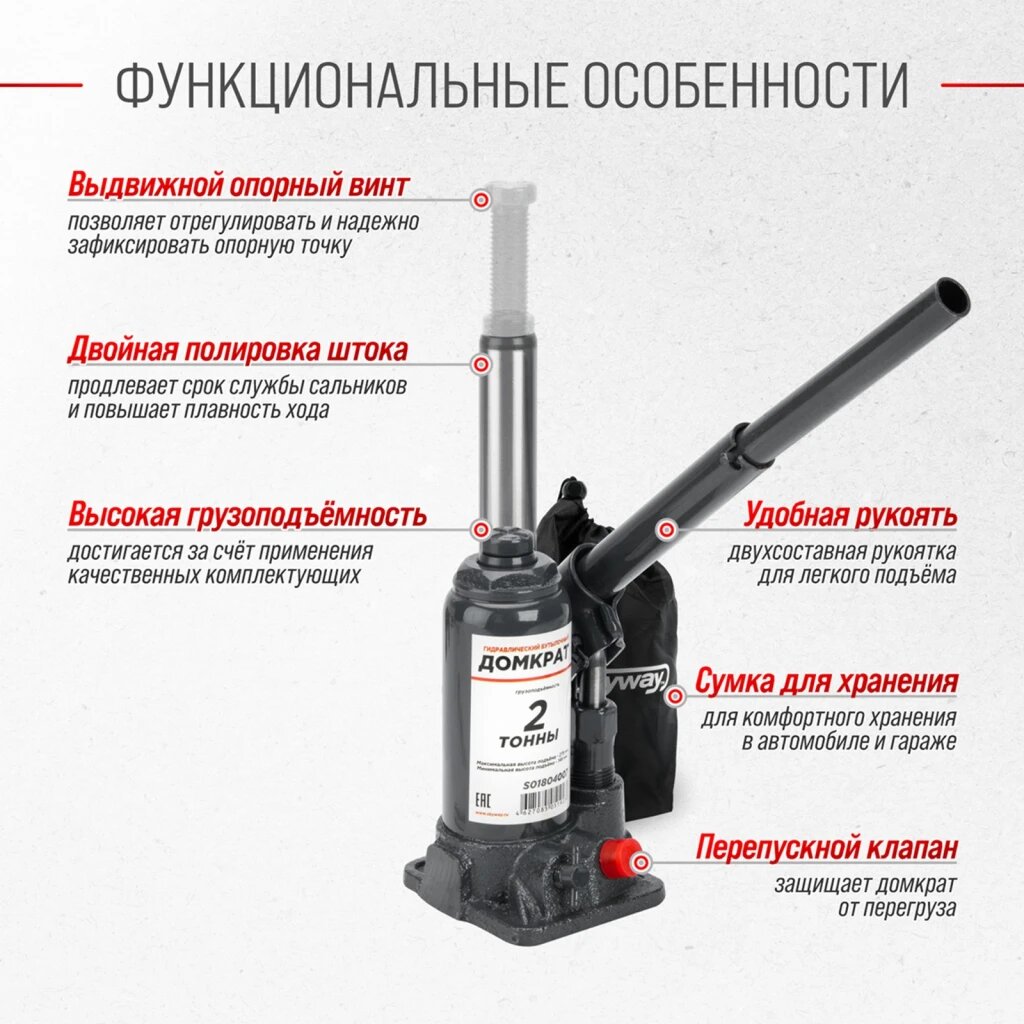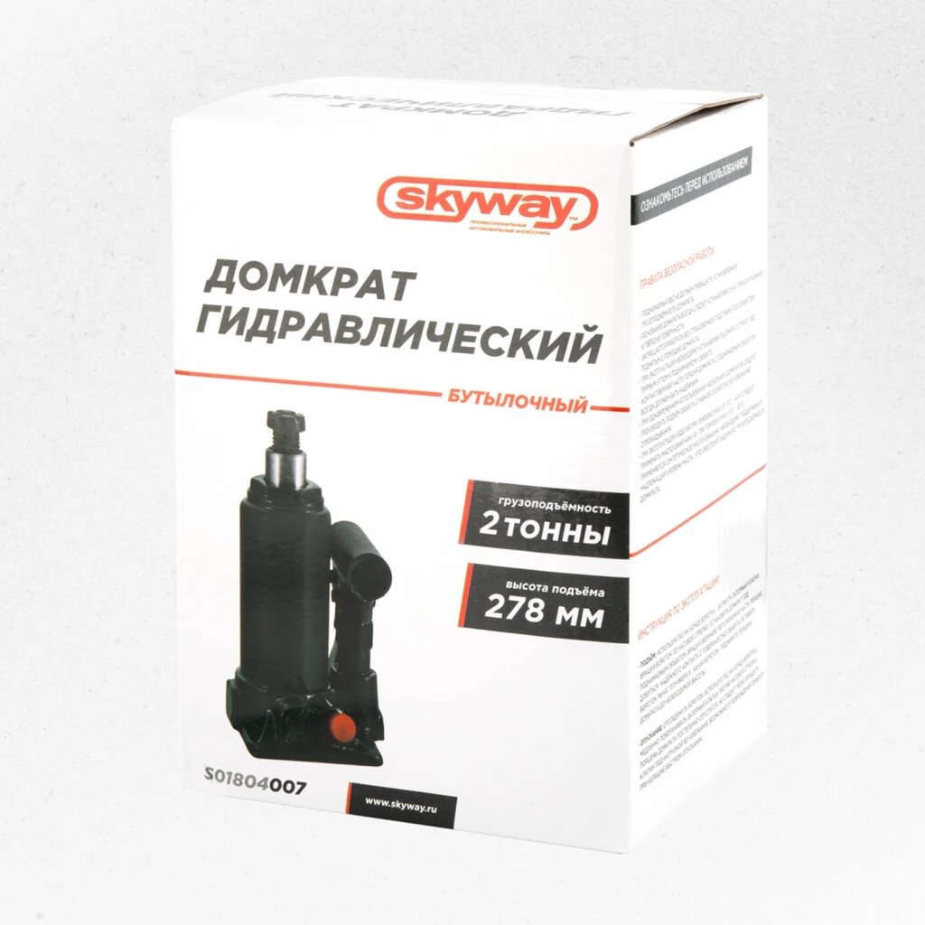 От поломок на дороге не застрахован никто, к тому же необходимость, к примеру, заменить колесо может возникнуть в любую минуту. Чтобы не тратить время и устранить поломку самостоятельно, часто требуется приподнять автомобиль весом несколько тонн. Справиться с такой задачей и при этом затратить минимум собственных сил, помогает компактный и надежный Домкрат SKYWAY. При небольших габаритах, прибор героически поднимает от земли не только легковой автомобиль, но также и грузовой транспорт. Теперь вы легко сможете и без лишних физических нагрузок поднять автомобиль и по возможности устранить поломку. Просто возьмите с собой удобный и качественный Домкрат SKYWAY! Гарантия 1 год