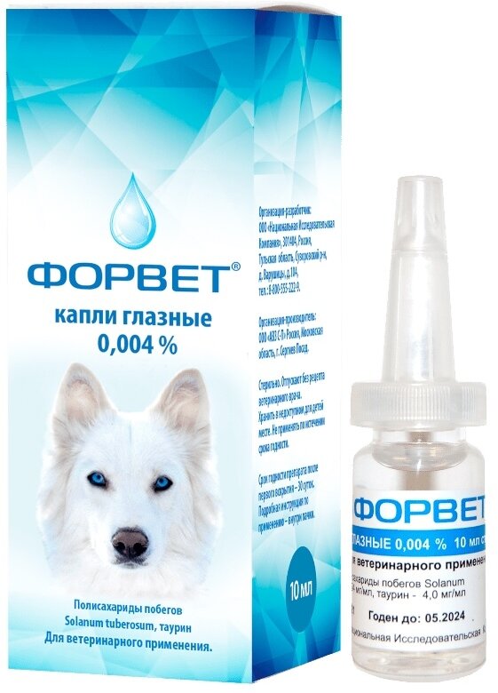 Глазные капли Форвет. Активной субстанцией препарата является ПАНАВИР – растительный активный полисахарид, который обладает комплексным противовирусным, иммуномодулирующим, противовоспалительным действием при лечении инфекционных и неинфекционных заболеваний глаз различной этиологии. Дополнительно в состав глазных капель входит ТАУРИН– серосодержащая аминокислота, обладающая противовоспалительным, регенерирующим и цитопротективным действиями.Почему глазные капли Форвет - препарат первого выбора:Обладают комплексным действием;Эффективны при лечении острых и хронических инфекций глаз;Профилактируют бактериальные и вирусные инфекции глаз;Имеют растительное происхождение;Не раздражают глаза после закапывания;Безопасны для котят, щенков, беременных и лактирующих кошек и собак;Одобрены ведущими офтальмологами;Предупреждают дегенеративные изменения глаз.