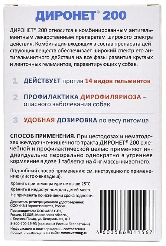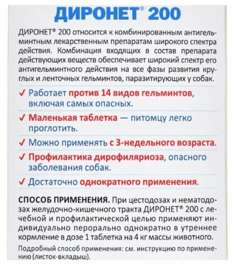 | Размер | Диронет для мелких пород 200мг/таб |