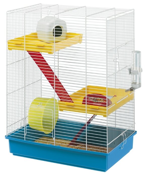 Ferplast Hamster Tris - вертикальная клетка для хомяков, разработанная для активного времяпрепровождения вашего питомца, в то же время она компактная и не занимает много места. Комплектуется пластиковыми полками с лесенками, это идеальная клетка для активных хомяков. В комплекте вы также найдете другие аксессуары: маленький пластиковый домик, колесо, поилку и кормушку. Удобные маленькие дверки в передней части клетки подходят для ежедневной уборки.