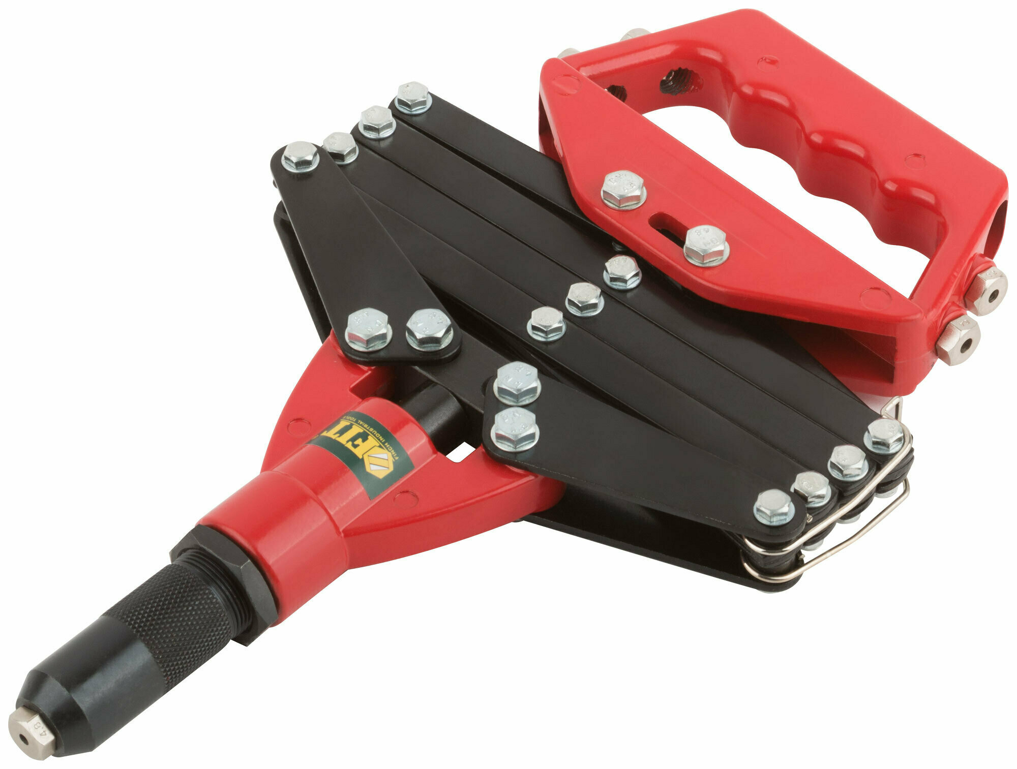 Для крепления вытяжных алюминиевых и стальных заклёпок. 5 быстросменных насадок (3.2-4.0-4.8-6.0-6.4 мм), рабочий ход 10 мм, сила вытяжения заклепки > 9000 H, пружинный рычаг для выброса оправ от заклепок. Для работ с большим усилием. Для профессионального использования. Упаковка: картонная коробка.