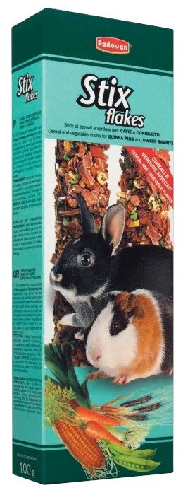 PADOVAN STIX FLAKES CONIGLIETTI палочки овощные для кроликов и морских свинок 2 х 50 грЛакомство палочки овощные для кроликов и морских свинок. Ключевые особенности:Изготовлены из натуральных ингредиентов.Обеспечивают всеми необходимыми питательными веществами.Две аппетитные палочки, спрессованные из тщательно подобранной смеси семян, овощей, печенья и полезных пищевых добавок.Упаковка в модифицированной газовой среде.Снабжены приспособлением для удобного крепления лакомства внутри клетки. Рассыпчатые запеченные палочки с хлопьями овощей, дополнительное питание к обычному рациону животных. Подходит для питания взрослых декоративных кроликов, морских свинок и шиншилл. Состав:Злаки, овощи (морковные хлопья – 3 %, чечевица – 2 %), хлебопродукты, сахара, фрукты, минеральные вещества. Гарантированный анализ:Белки – 11,5 %Жиры – 1,5 %Клетчатка – 2 %Зола – 2 %Влажность – 7 %. Добавки (на 1 кг):Пищевые красители. Рекомендации по кормлению:Закрепите палочку к клетке и оставьте ее доступной для животного. Количество в упаковке: 2 шт. Вес: 100 гр. Страна-производитель: Италия.