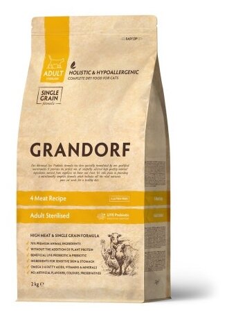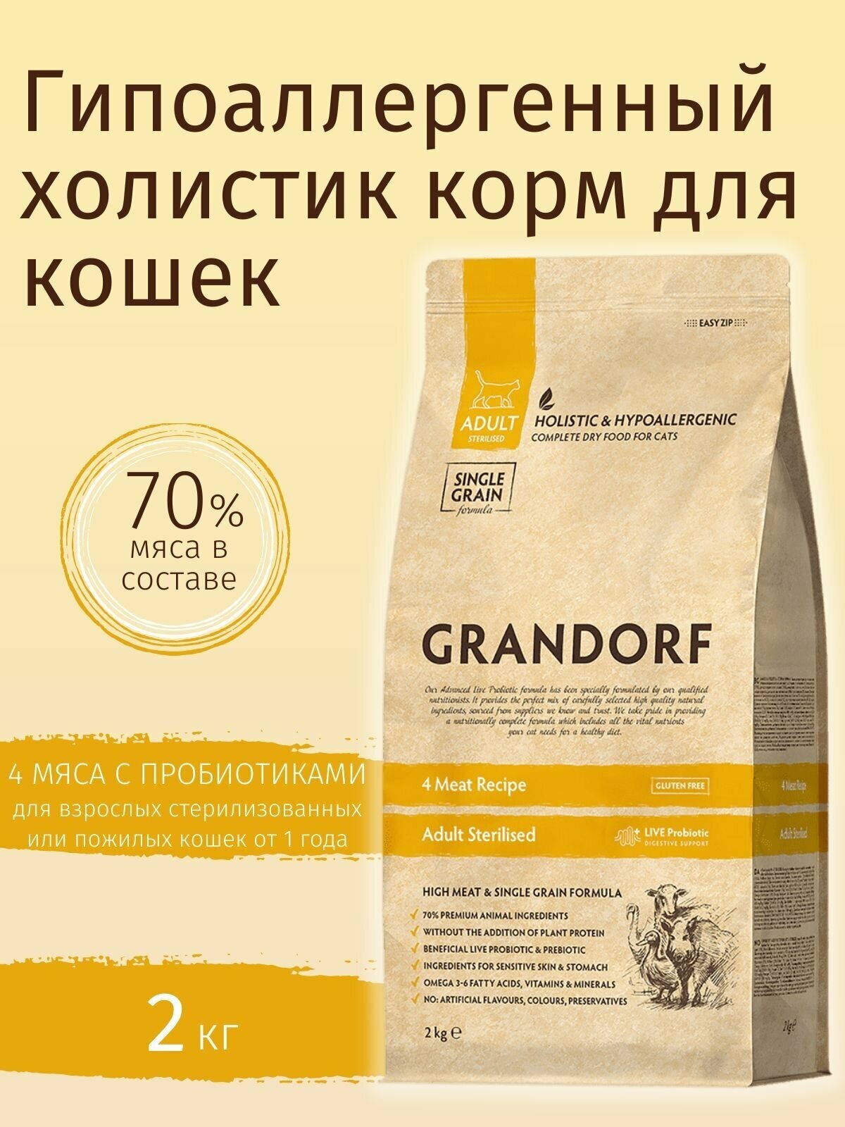 Корм для кошек GRANDORF для стерилизованных, Четыре вида мяса с бурым рисом сух. 2кг (размер: Для всех пород)