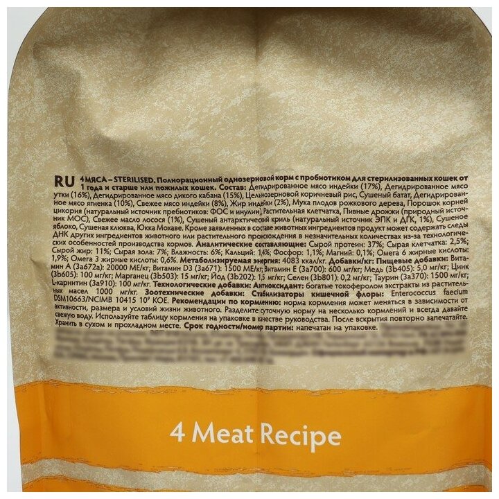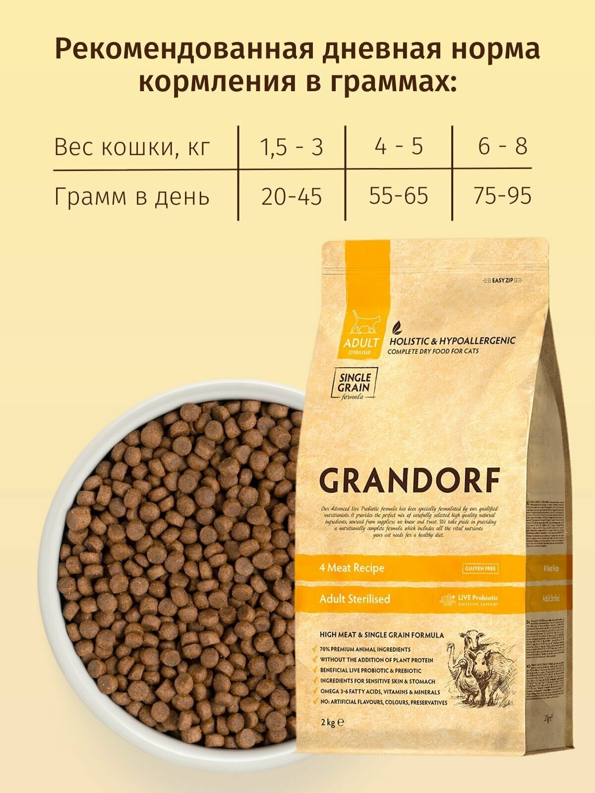 Описание о корме Grandorf Sterilised для стерилизованных кошек 4 вида мяса с рисом и пробиотиками
