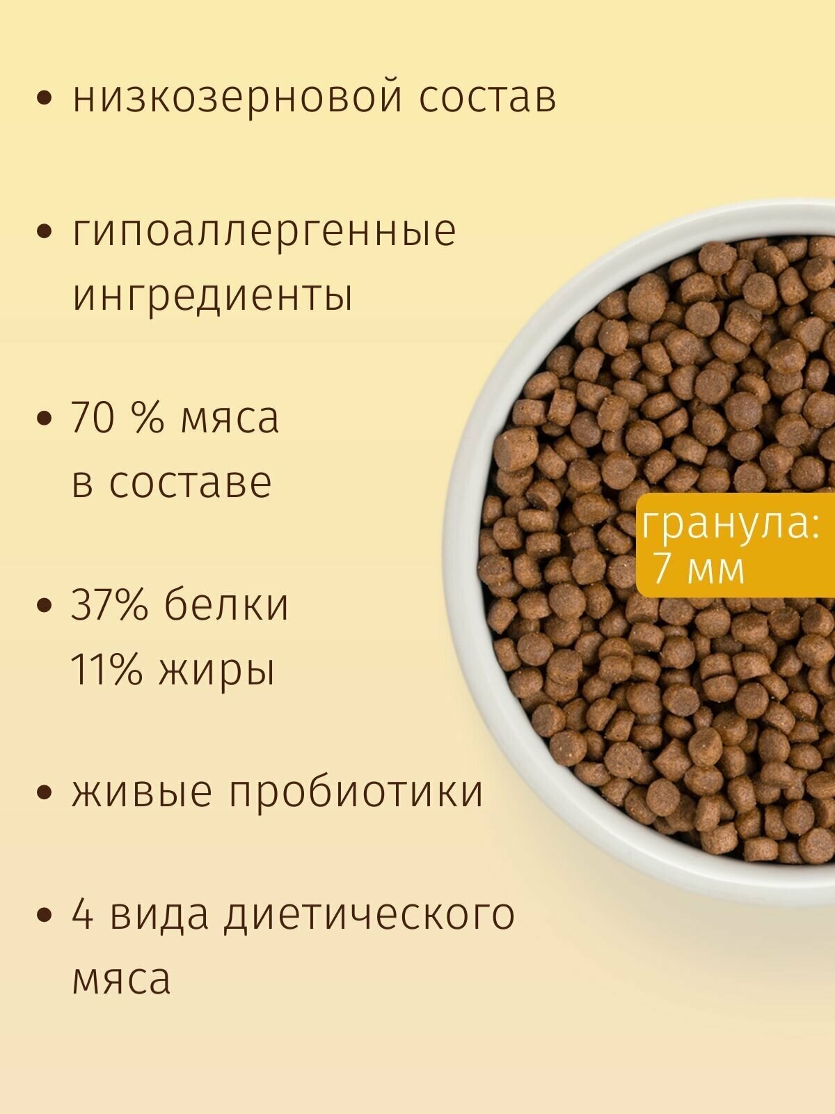 Преимущества: + 70% мяса в составе корма + Только животные белки + 1000000000 КОЕ/кг живых пробиотиков + Только гипоаллергенные ингредиенты + Только мясо без субпродуктов + Комплекс хондропротекторов + Баланс соотношения Omega 6-3 + Контроль уровня кислотности рН + Низкий уровень золы в составе + Натуральные антиоксиданты + Бережный способ приготовления